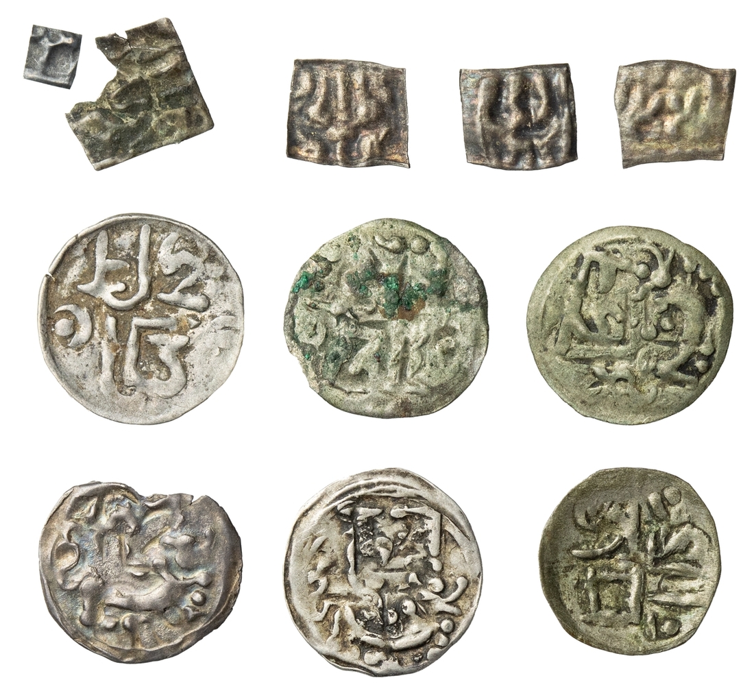 Nepal, Harihara Simha (c.1600-1609), Dam (Tangka standard) (3), Obv. Śrī/Hari crescent and dot (sun) each side of Śrī. Rev. Hara above lion (simha); Dam (Tangka) (3), unclear but possibly, Obv. Śrī/ Jaya, Rev. Hara, above lion (RGV 247 or 248, 249), fine to very fine, rare; and, Anonymous, fractions of Jawas (3), representing a quarter of the full unit (RGV 373; KM 284), very rare, one broken, fine or better (9)