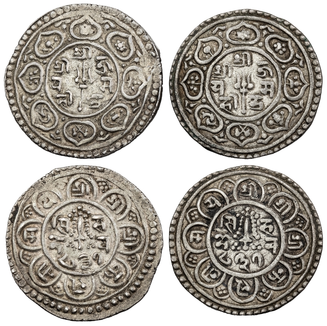Nepal, Jaya Mahindra Simha (1717-1722), Mohar, NS 837 (2), Obv. trident in central circle with legend Śrī Śrī Jaya Mahīndra, the eight petals attached to the central circle contain the eight Buddhist emblems (astamangala), the two fishes (southwest position) on obverse are swimming anti-clockwise on one coin and clockwise on the other, Rev. sword with garland in central circle and legend Si?ha Deva 837, the eight attached petals contain the legend Śrī Śrī Kalū?āmaya, 5.43g, 11h; 5.36g, 12h (RGV 451, 452), the first possibly previously mounted, both very fine (2)