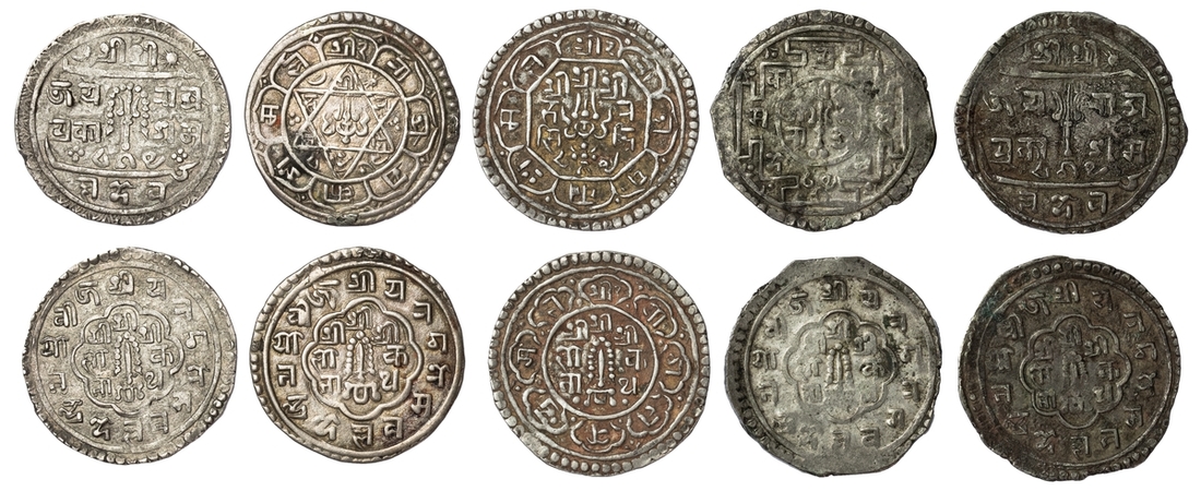 Nepal, Jaya Rajya Prakash Malla (1745-1758), Mohars, NS 865 (5), all different types or variants (RGV 482, 483 var., 484, 485, 486, 488), RGV 485 lightly double struck, RGV 488 with deposits, generally fine to very fine (5)