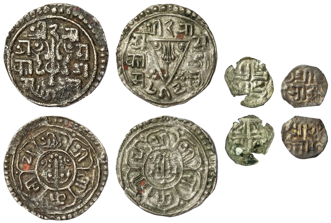 Nepal, Jaya Rajya Prakash Malla (1745-1758), Suki, NS 865, Obv. trident in centre and legend Śrī 2 Rājya Prakaśa Malla, Rev. sword with garland in central circle, one syllable of legend Śrī Śrī Lokanātha in each of the six petals, pellets in outer angles,1.35g, 12h (RGV 490), pitted surfaces, very fine; Suki NS 865, Obv. trident within inverted triangle and legend Śrī 2 Rā/jya Pra/kaśa/ Malla/ 865, Rev. sword with garland in central circle, one syllable of legend Śrī Śrī Lokanātha in each of the six petals, pellets in outer angles, 1.25g, 2h (RGV 492), hairline flan flaws to reverse and with spots of red deposits, otherwise toned, very fine; uniface Dam (2), undated, one coin has legend Śrī/Rā/jya, crescent and dot (sun) on either side of Śrī (RGV 493), one with part of flan missing, fine to very fine (4)