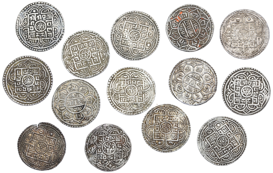 Nepal, Prithvi Narayan Shah (1742-1775), Mohar, SE 1676 (14), Obv. small central square with trident, surrounded by legend, all this within square which has openings on the four sides and two double arches attached to each side, legend Śrī Śrī P?thvī/ Nārā/ya?a/Sāha Deva and date 1676 below, within two double arches, Rev. central circle with eight petals attached to it, sword with garland between two horizontal lines in centre of circle, and legend Śrī Śrī Bhavānī, legend in petals Śrī Śrī Śrī Gorakhanātha, (RGV 586, 586a, 587, 587a, 587b, 589), a good selection of different types typical of Mohar of this date, fine to extremely fine (14)