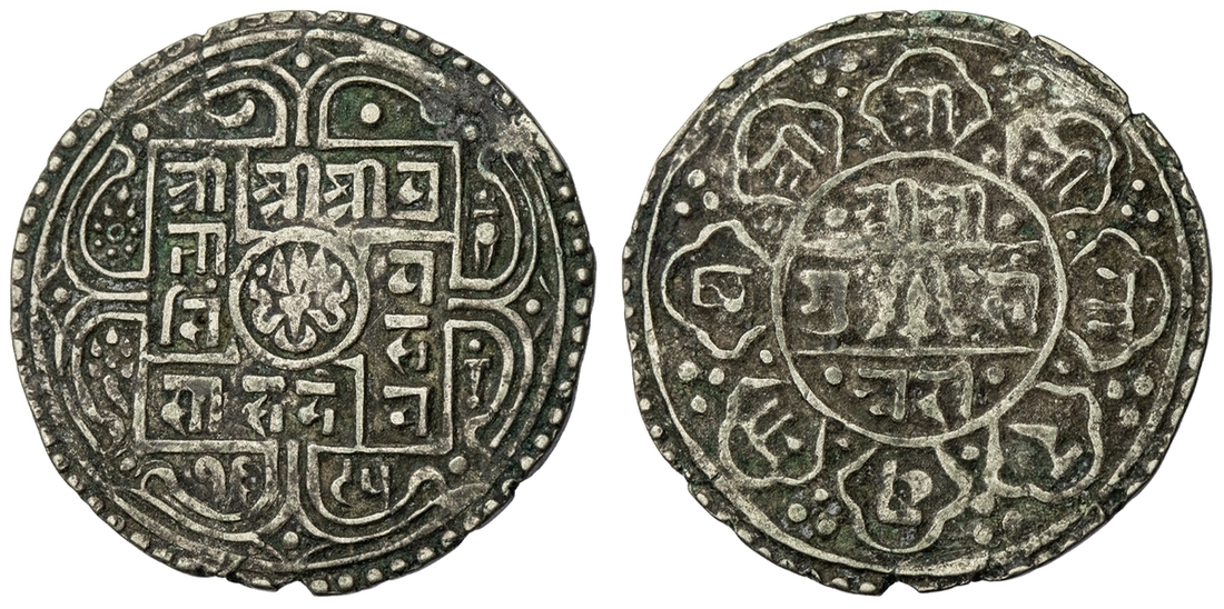 Nicholas Rhodes suggests that the date 1695 must have been engraved in error, as it is very unlikely that Prithvi Narayan would have allowed his son to strike coins in his own name during the former’s lifetime (RGV. p. 133).