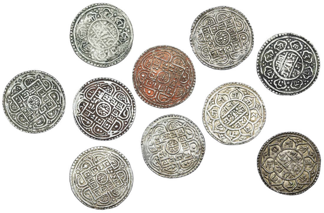 Nepal, Pratap Simha Shah (1775-1777), Mohar (10), SE 1696; SE 1697 (2); SE 1698 (3), struck for export to Tibet; SE 1698 (2); SE 1699 (2), struck for export to Tibet, Obv. small central square with trident, surrounded by legend, all this within square which has openings on the four sides and two double arches attached to each side, legend Śrī Śrī Śrī Pra/tāpa/ Si?ha/Sāha Deva, date 1696 below within two double arches. Moon in upper left double arch and sun in upper right double arch, cakra (discus) and lotus flower within double arches on left side, conch and mace within double arches on right side, Rev. central circle with eight petals attached to it, sword with garland between two horizontal lines in centre of circle, legend Śrī Śrī Guhyeśvarī, legend in petals Śrī Śrī Śrī Gorakhanātha (RGV 637, type 1, 639, type 2, 642, type 3, 643, type 3; KM 472.1), some with deposits and areas of softness, otherwise generally tone, fine to good very fine (10)