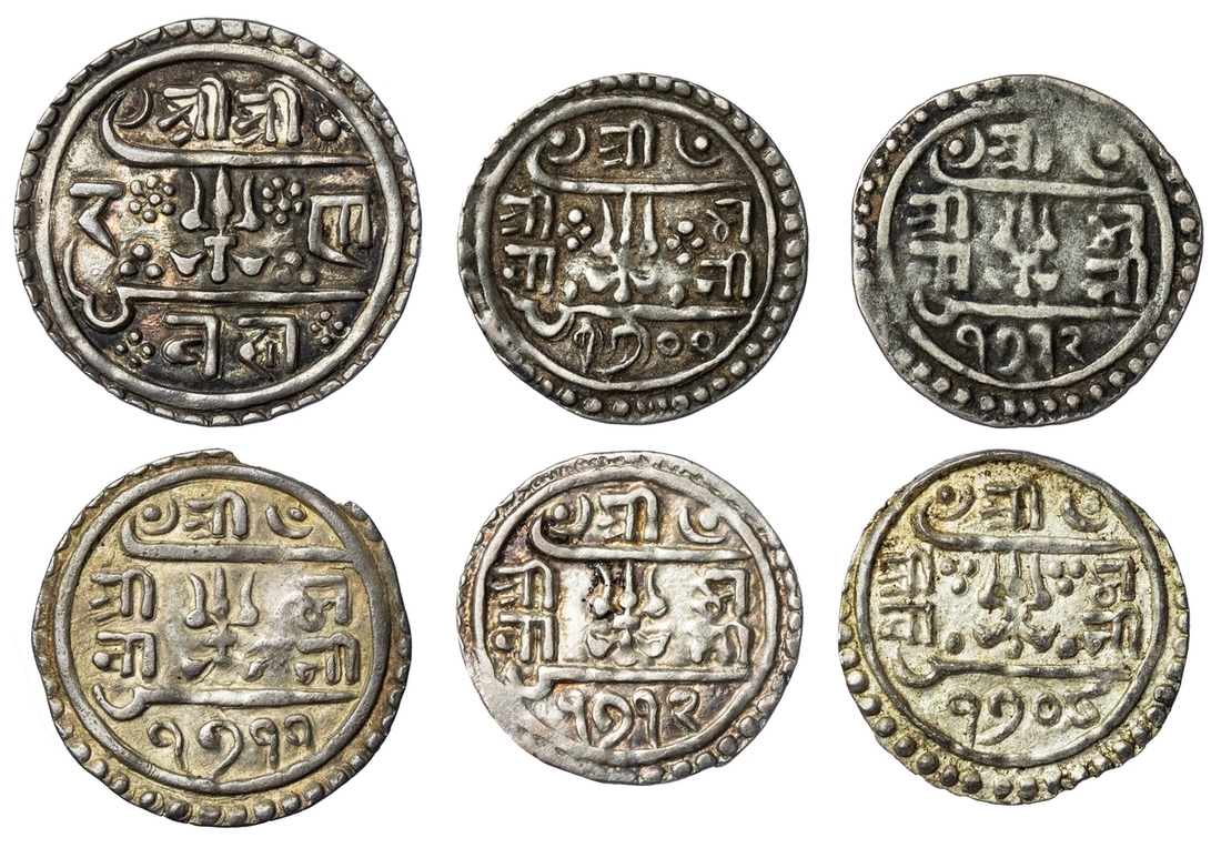 Rev. trident between two pseudo-Persian characters and legend Śrī/ Śrī Bha/vānī/1708; Suki (3), in the name of Raja Rajeshvari (senior queen of Rana Bahadur), SE 1711; SE 1712 (2), Obv. water pot with garland in centre and legend, Śrī 3/Raja/Rāje/ śvarī/Devī, Rev. trident in centre between two pseudo-Persian characters and legend Śrī/ Śrī Bha/vānī/1711 (RGV 709 this coin, 711, 712 this coin, 714 ; KM 470.2), fine to good very fine (6)
