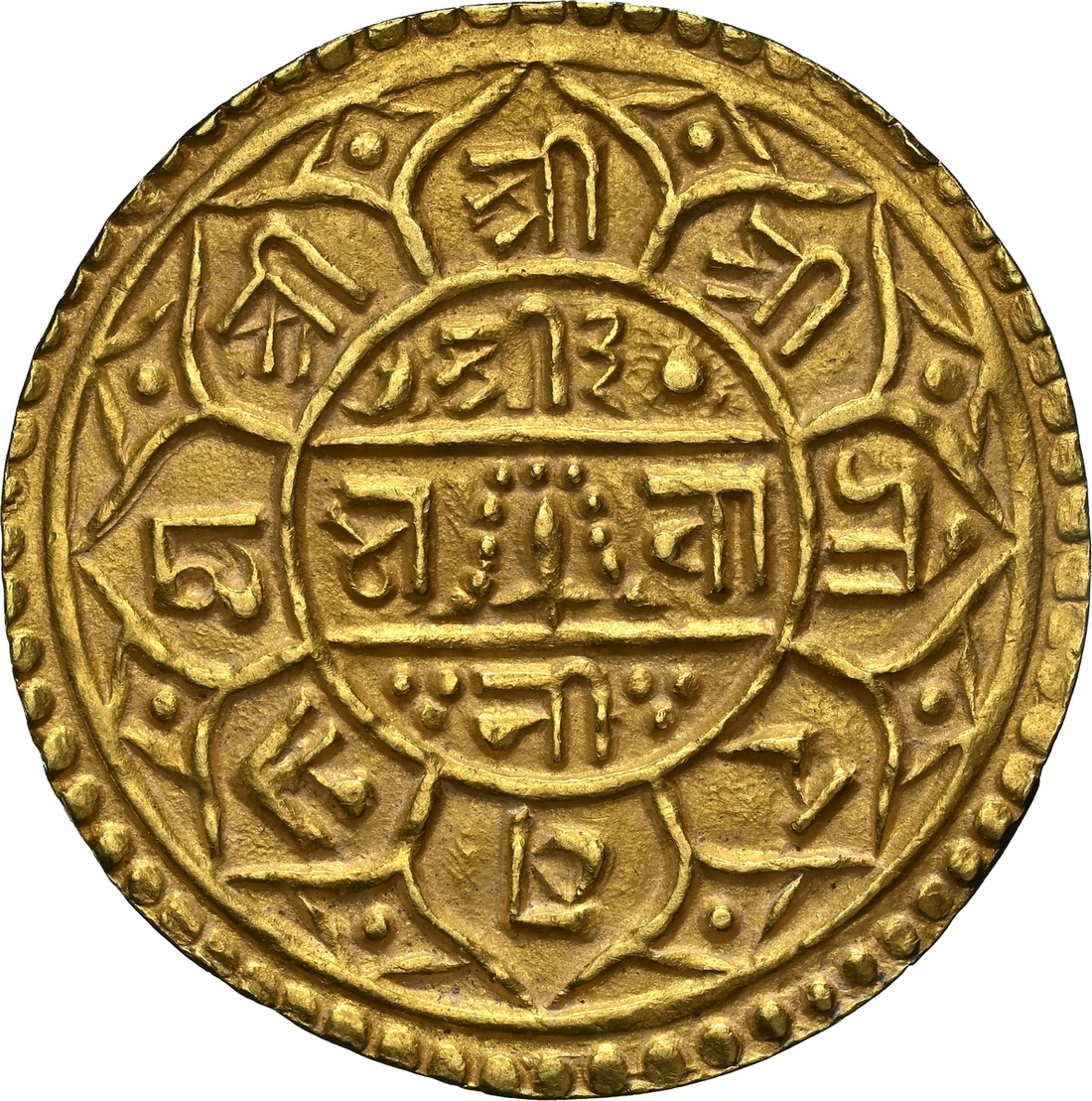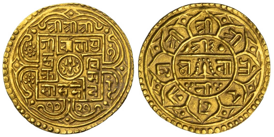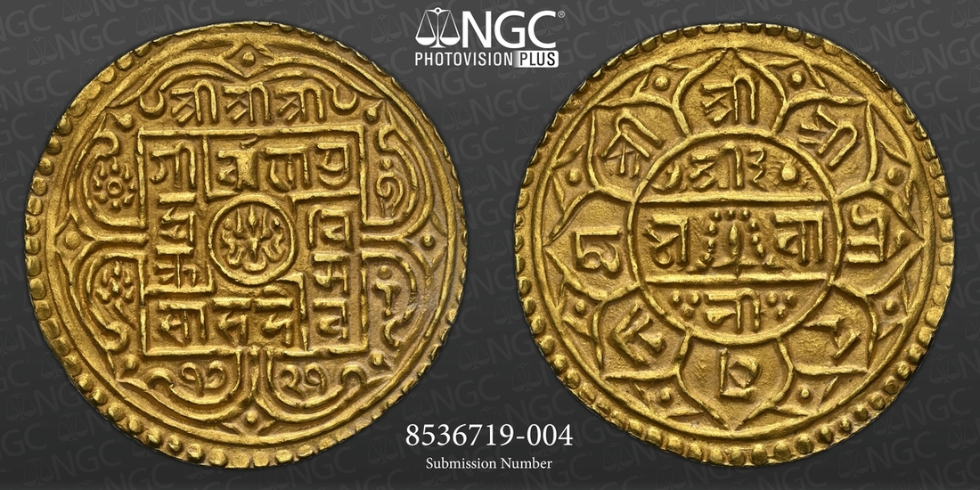 (g) NGC AU58 | Nepal, Girvan Yuddha Vikram Shah (1799-1816), gold Mohar, SE 1721, Obv. small central circle with trident, surrounded by legend, all this within square which has openings on three sides and two double arches attached to three sides, but only a single arch attached to the upper side of the square, legend Śrī Śrī Śrī/ Gīrvā?a Yu/ddha Vi/krama/Sāha Deva and date 1721 below, within two double arches, moon in upper left double arch and in upper right double arch, cakra (discus) and lotus flower within double arches on left side, and conch and mace within double arches on right side, Rev. central circle with eight petals attached to it, sword with garland between two horizontal lines, and legend Śrī 3/Bhavā/nī in centre of circle, legend in petals Śrī Śrī Śrī Gorakhanātha, 5.46g (RGV 731, type 1; KM 544), lightest of wave through flan edge, about extremely fine, in NGC holder, graded AU58 (Cert. #8536719-004)