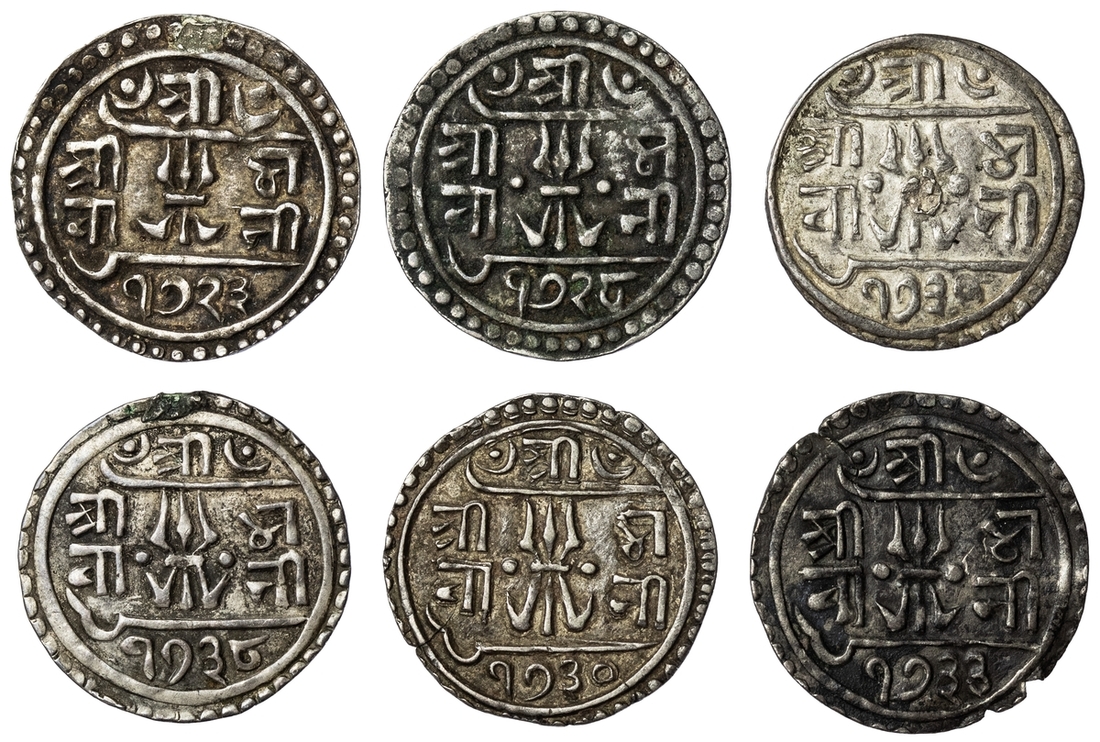 Nepal, Girvan Yuddha Vikram Shah (1799-1816), Suki (6), Suki, SE 1723, in the name of Raja Rajeshvari (as regent for Girvan Yuddha), Obv. water pot with garland in centre and legend Śrī 3/Raja/Rāje/ śvarī/Devī, Rev. trident in centre between two pseudo-Persian characters and legend Śrī/ Śrī Bha/vānī/1723, 1.33g, 12h; and, Suki, SE 1728, in the name of queen Lalita Tripura, Obv. mirror on stand and legend around Śrī/Lali/ta Ttri/pura Sunda/rī Devī, Rev. trident between two pseudo-Persian characters, legend Śrī/ Śrī Bha/vānī/1728, 1.31g, 12h; and, Suki (3), SE 1730; 1733, in the name of Siddhi Lakshmi Devi, Obv. offering vase with garland and crescent and dot above, legend Śrī Śrī/Siddhi/Lak?mī /Devī, Rev. trident in centre between two pseudo-Persian characters, legend Śrī/ Śrī Bha/vānī/date, variant dies; 1.38g, 11h; 1.27g, 12h; and, Suki, SE 1738, in the name of Goraksha Rajya Devi, Obv. mirror in centre, crescent and sun on either side of upper part of mirror and pellet on either side, legend Śrī/ Gora/k?a Rā/jya La/k?mī Devī., Rev. trident between two pseudo-Persian characters, legend Śrī/ Śrī Bha/vānī/1738, 1.32g, 12h; another, much as before, SE 173[?], last digit overstruck,1.33g, 12h (RGV 803, 807, 809, 811, 813), the first and example dated 1738 previously mounted, the 1733 example crimped, generally fine to extremely fine (6)
