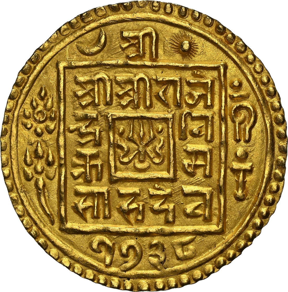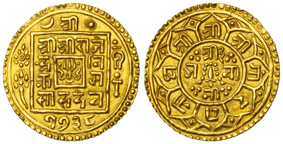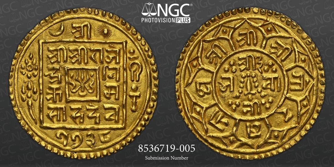 (g) NGC MS64 | Nepal, Rajendra Vikram Shah (1816-1847), gold Mohar, SE 1738, Obv. small central square with trident, surrounded by legend Śrī/ Śrī Śrī Rāje/ndra/Vi/krama/Sāha Deva, date below, 1738, cakra (discus) and lotus flower on left side, and conch and mace on right side of square, Rev. central circle with eight petals attached to it, in centre of circle small sword with garland, no horizontal lines, legend Śrī 3/Bhavā/nī, legend in eight petals Śrī Śrī Śrī Gorakhanātha, edge milled, 5.50g, 24mm (RGV 830, type 1 this coin; KM 579), well struck, good very fine and rare, in NGC holder, graded MS64 (Cert. #8536719-005)