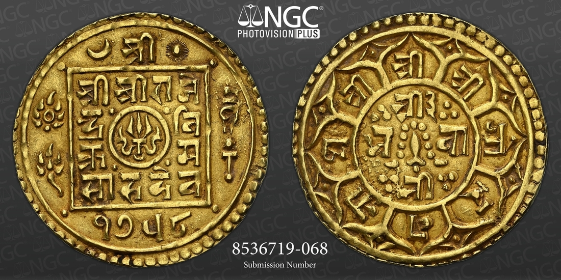 (g) NGC UNC | Nepal, Rajendra Vikram Shah (1816-1847), gold Mohar, SE 1758, Obv. small central square with trident, surrounded by legend Śrī/ Śrī Śrī Rāje/ndra/Vi/krama/Sāha Deva, date below, 1758, cakra (discus) and lotus flower on left side, and conch and mace on right side of square, four pellets outside of circle, Rev. central circle with eight petals attached to it, in centre of circle small sword with garland, no horizontal lines, legend Śrī 3/Bhavā/nī, legend in eight petals Śrī Śrī Śrī Gorakhanātha, 5.47g, 27mm (RGV 834, type 4.1 this coin), very fine and rare, in NGC holder, graded UNC DETAILS ~ Edge filing (Cert. #8536719-068)