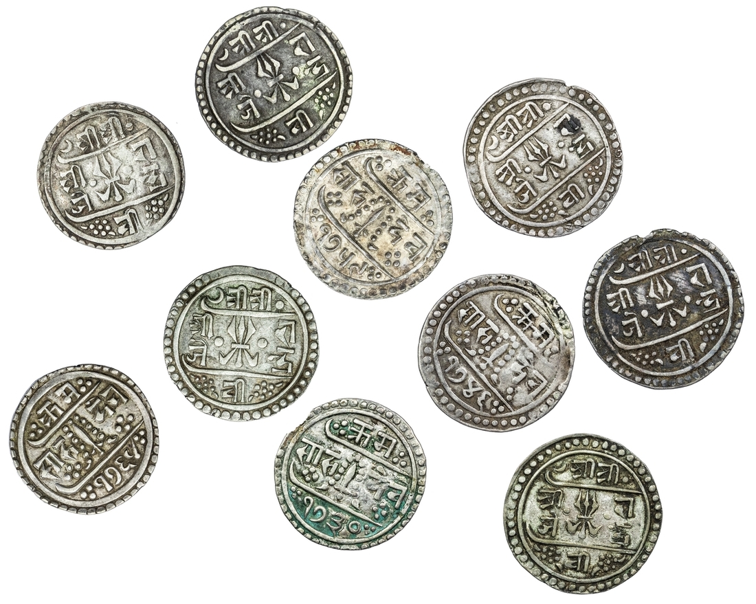 Nepal, Rajendra Vikram Shah (1816-1847), Half-Mohar (10), SE 1730; SE 1746 (3); SE 1755 (2); SE 1759; SE 1764; SE 1766 (2), (RGV 901 var.,904, 907, 909, 911, 913), first coin with mount removed from centre of obverse and with verdigris, about very fine yet rare, others fine to extremely fine (10)