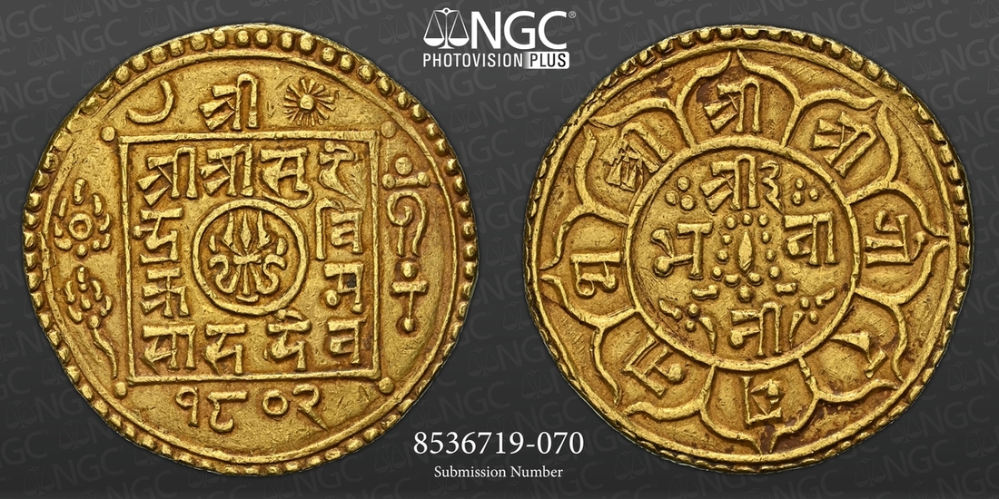 (g) NGC UNC | Nepal, Surendra Vikram Shah (1847-1881), gold Bakla Asarphi, SE 1802, Obv. trident in central circle, surrounded by legend Śrī/ Śrī /Śrī Sure/ndra Vi/krama/ Sāha Deva within square, date 1802 below, moon to left and sun to right of Śrī above, cakra and lotus flower to left and conch and mace to right of square, Rev. small sword with garland and legend Śrī 3/ Bhavā/nī within central circle, in eight attached petals legend Śrī Śrī Śrī Gorakhanātha, 12.29g (RGV 951, type 1(a)), with some light contact marks and softness to edge, very fine, in NGC holder, graded UNC DETAILS ~ Rim filing (Cert. #8536719-070)
