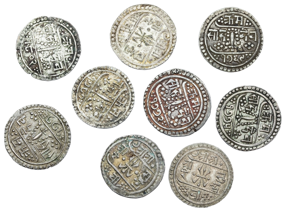 Nepal, Surendra Vikram Shah (1847-1881), Half-Mohars (9), SE 1769; SE 1770; SE 1771; SE 1772; SE 1775; SE 1776; SE 1787 (2); SE 1802 (RGV 1038, 1039, 1040, 1041, 1042, 1044, 1045, 1046; KM 601), some with deposits, generally very fine (9)