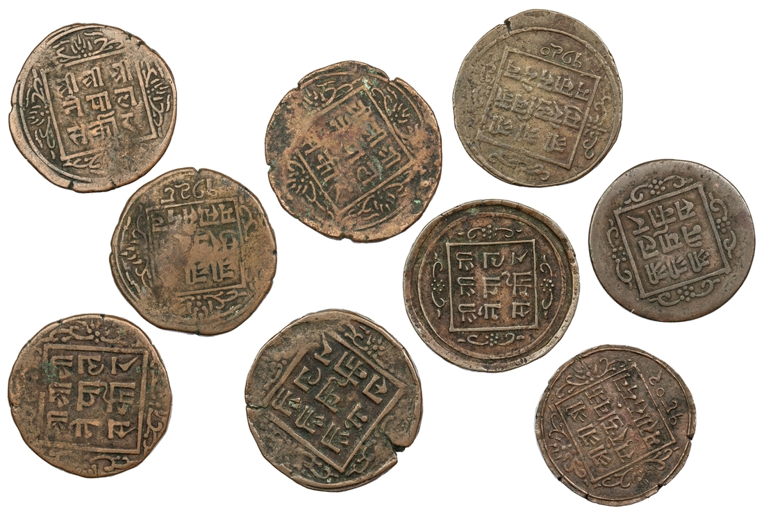 Nepal, Surendra Vikram Shah (1847-1881), copper 2-Paisa, SE 1788, Obv. Sri Sri Sri/ Surendra Vikr/ama Saha Deva within square, ornamentation around and date below, Rev. Sri Sri Sri Nepala Sarkara within square, 8.30g, 27mm (RGV 1075), fine and rare; and, 2-Paisas (7), SE 1790, 7.36g, struck with 1-Paisa dies (RGV 1076), very fine, rare; SE1790 (2), flan and design variants (RGV 1077, 1078), very fine and about fine; SE1791; SE 1796 (2); SE 1798 (RGV 1080, 1081, 1082), very fine; finally, SE1802, struck for presentation only (RGV 1083), ragged edge, good very fine and very rare, (9)