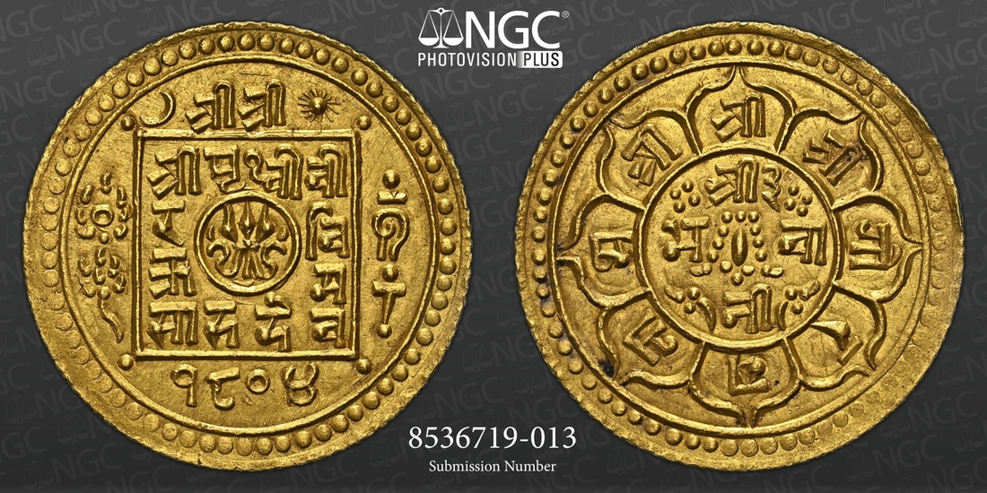(g) NGC MS63 | Nepal, Prithvi Vir Vikram Shah (1881-1911), gold Bakla Asarphi, SE 1804, Obv. trident in central circle, surrounded by legend Śrī Śrī /Śrī P?thvī Vī/ra Vi/krama/ Sāha Deva, the first two Śrī outside square, date 1804 below, above, moon to left and sun to right of Śrī Śrī, cakra and lotus flower to left and conch and mace to right of square, pellet and line above conch, crescent moon without dot to left of Śrī Śrī, Rev. within central circle, small sword with garland and legend Śrī 3/ Bhavā/nī, legend Śrī Śrī Śrī. Gorakhanātha in eight attached petals, no pellets outside of petals, edge milled, 12.38g, 28.4mm (RGV 1128, type 3 this coin), with some deposits to fields, yet lustrous, extremely fine, in NGC holder, graded MS63 (Cert. #8536719-013)