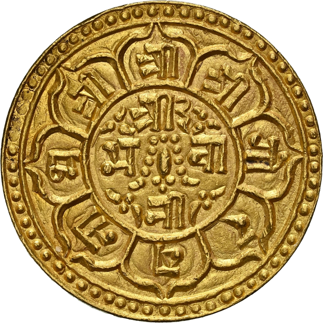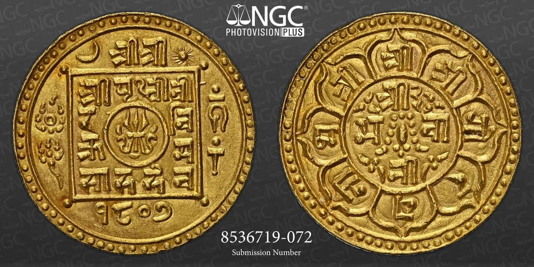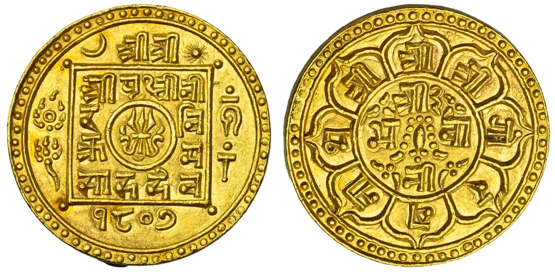(g) NGC MS63 | Nepal, Prithvi Vir Vikram Shah (1881-1911), gold Bakla Asarphi, SE 1807, Obv. trident in central circle, surrounded by legend Śrī Śrī /Śrī P?thvī Vī/ra Vi/krama/ Sāha Deva, the first two Śrī outside square, date 1807 below, above, moon to left and sun to right of Śrī Śrī, cakra and lotus flower to left and conch and mace to right of square, pellet and line above conch, Rev. within central circle, small sword with garland and legend Śrī 3/ Bhavā/nī legend Śrī Śrī Śrī. Gorakhanātha in eight attached petals, no pellets outside of petals, edge plain, 12.34g, 26mm (RGV 1130, type 5 this coin), with some lustre and golden-honey toning in parts, about uncirculated, in NGC holder, graded MS63 (Cert. #8536719-072)