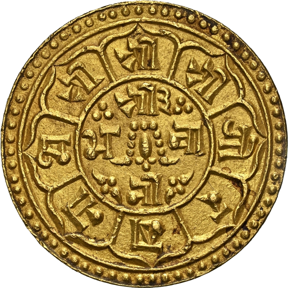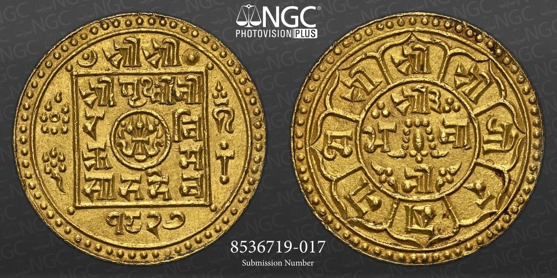 (g) NGC MS64 | Nepal, Prithvi Vir Vikram Shah (1881-1911), gold Bakla Asarphi, SE 1827, Obv. trident in central circle, surrounded by legend Śrī Śrī /Śrī P?thvī Vī/ra Vi/krama/ Sāha Deva, the first two Śrī outside square, date 1827 below, above, moon with pellet to left and sun to right of Śrī Śrī, cakra and lotus flower to left and conch and mace to right of square, three pellets and line above conch, Rev. within central circle, small sword with garland and legend Śrī 3/ Bhavā/nī, legend Śrī Śrī Śrī. Gorakhanātha in eight attached petals, no pellets outside of petals, edge plain, 12.46g, 26mm (RGV -), lustrous, with some field deposits, near uncirculated, in NGC holder, graded MS64 (Cert. #8536719-017)