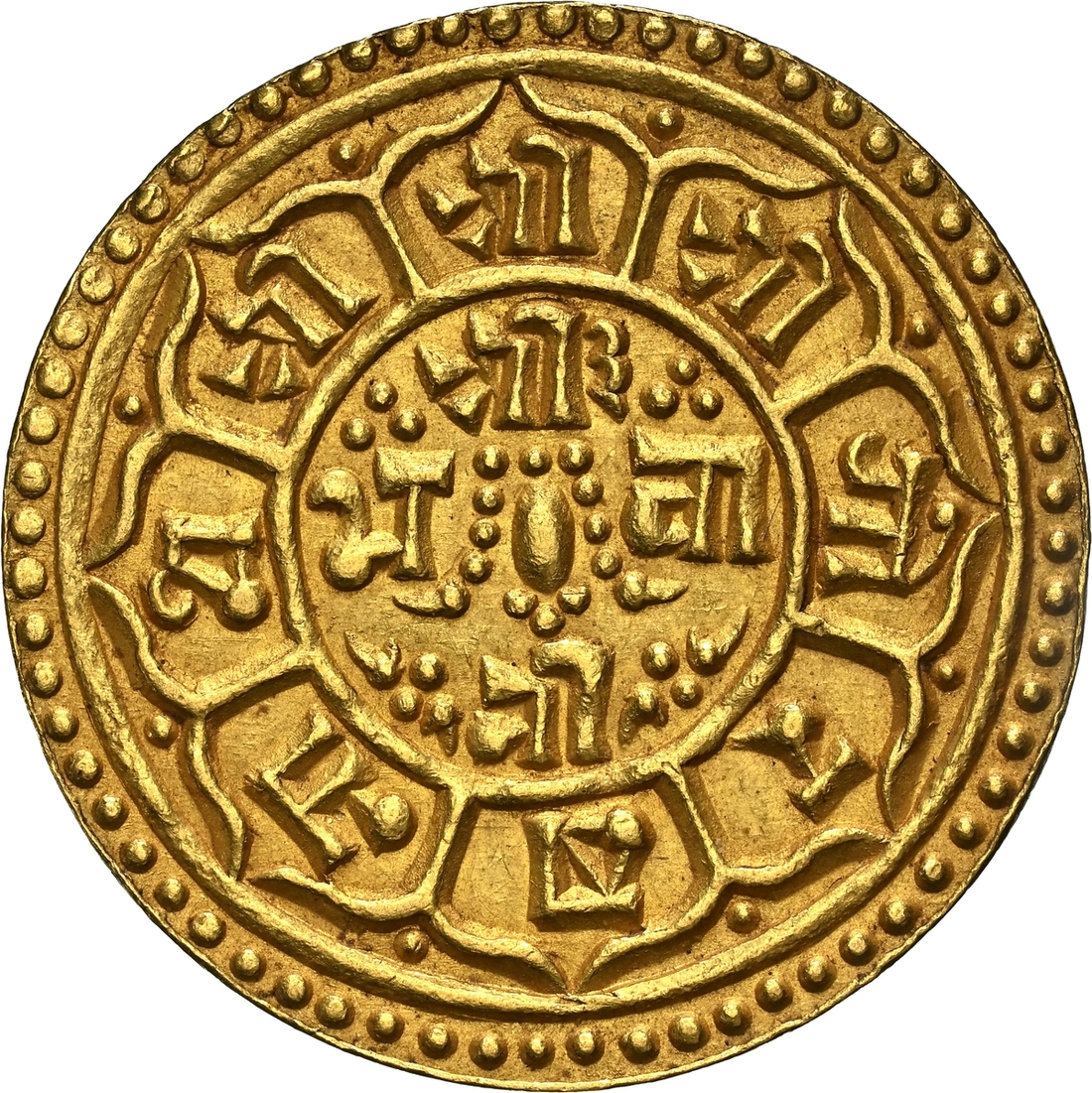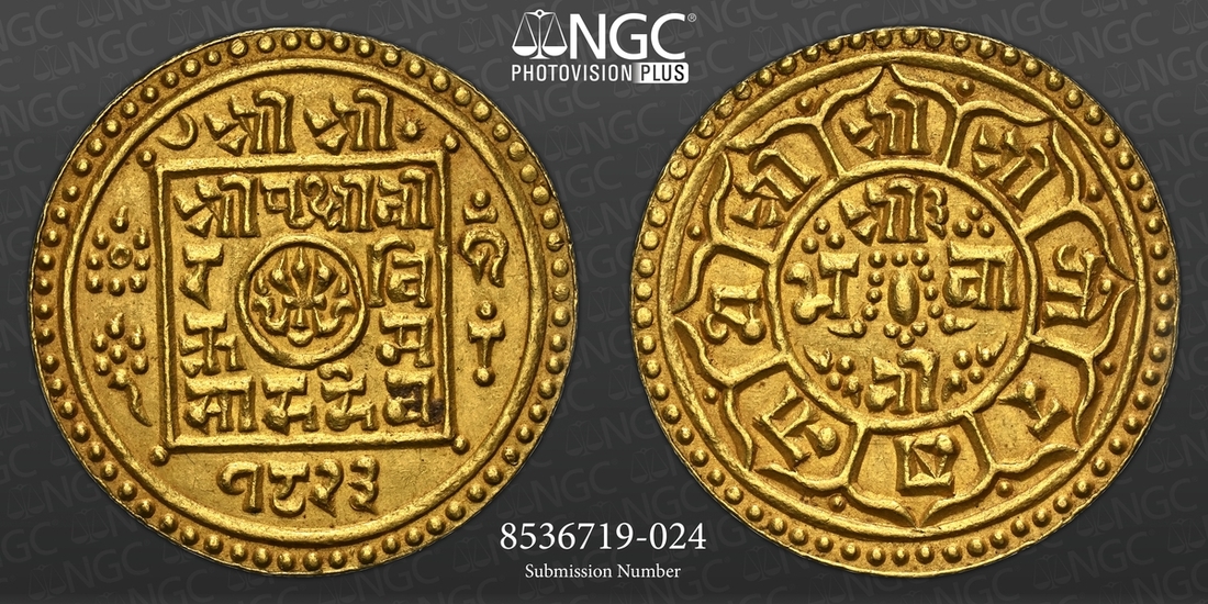 (g) NGC MS63 | Nepal, Prithvi Vir Vikram Shah (1881-1911), gold Patla Asarphi, SE 1823, Obv. trident in central circle, surrounded by legend Śrī Śrī /Śrī P?thvī Vī/ra Vi/krama/ Sāha Deva, the first two Śrī outside square, date 1832 below, above, moon to left and sun to right of Śrī Śrī, cakra and lotus flower to left and conch and mace to right of square, pellet and line above conch, Rev. within central circle, small sword with garland and legend Śrī 3/ Bhavā/nī, legend Śrī Śrī Śrī. Gorakhanātha in eight attached petals, pellets outside of petals, edge plain, 5.54g, 25mm (RGV 1151, type 9 this coin), about uncirculated, in NGC holder, graded MS63 (Cert. #8536719-024)
