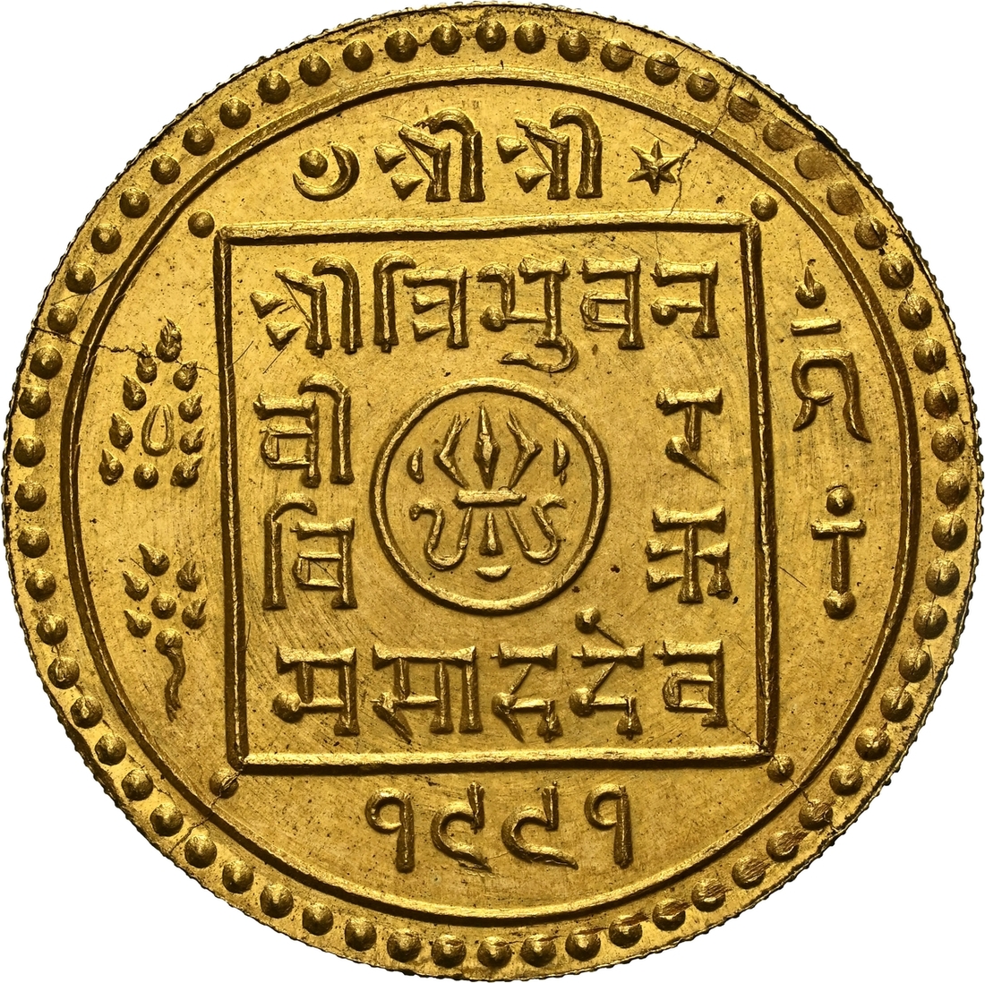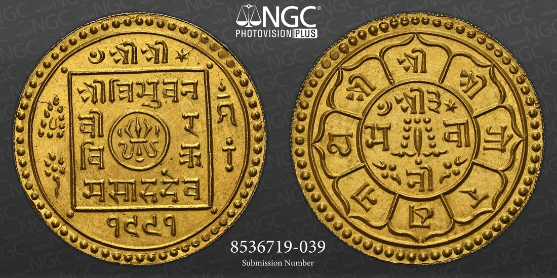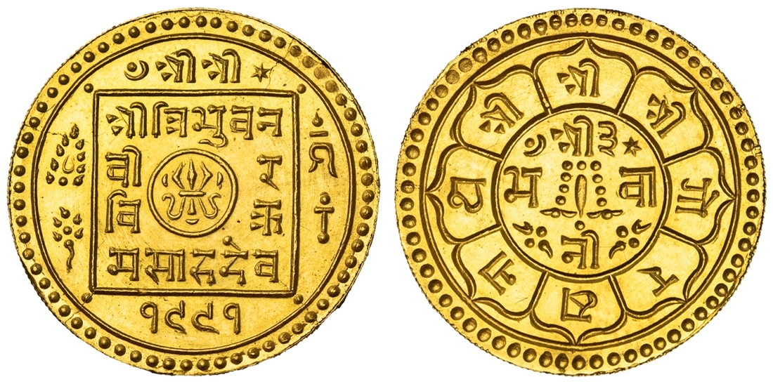 (g) NGC MS67 | Nepal, Tribhuvan Vira Vikrama Shah (1st reign, 1911-1955), gold Mohur, VS 1991 (1934), Obv. trident with ribbons within small central circle, legend around, Śrī Tribhuvana/Vīra/ Vikra/ma/Sāha Deva surrounded by square. Śrī Śrī with crescent and dot to left, and sun to right above square, date 1991 below square, cakra (disk) and lotus flower to left and conch shell and mace to right side of square, Rev. central circle with eight petals attached to it, in centre of circle sword with garland and legend Śrī 3 Bhavānī, moon to left and sun to right of Śrī 3, legend in eight petals Śrī Śrī Śrī Gorakhanātha, edge milled, 5.41g (KM 702), proof-like finish, uncirculated, in NGC holder, graded MS67 (Cert. #8536719-039)