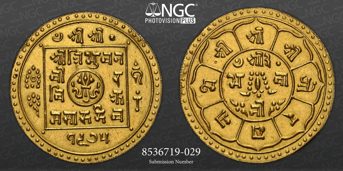 (g) NGC UNC | Nepal, Tribhuvan Vira Vikrama Shah (1st reign, 1911-1955), gold Asarphi, VS 1975 (1918), Obv. trident with ribbons within small central circle, legend around, surrounded by square, Śrī Tribhuvana/Vīra/ Vikra/ma/Sāha Deva. Śrī Śrī with crescent and dot to left and sun to right, above square and date 1975 below square, cakra (disk) and lotus flower to left and conch shell and mace to right side of square, Rev. central circle with eight petals attached to it, sword with garland and legend Śrī 3 Bhavānī in centre of circle, moon to left and sun to right of Śrī 3, legend in eight petals Śrī Śrī Śrī Gorakhanātha, edge milled, 12.36g (KM 703.1), minor field marking and light edge bruise, otherwise with some lustre, extremely fine, in NGC holder, graded UNC DETAILS ~ Obverse spot removed, rim filing (Cert. #8536719-029)