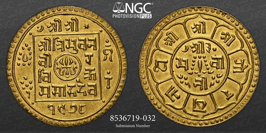 (g) NGC UNC | Nepal, Tribhuvan Vira Vikrama Shah (1st reign, 1911-1955), gold Asarphi, VS 1979 (1922), Obv. trident with ribbons within small central circle, legend around, surrounded by square, Śrī Tribhuvana/Vīra/ Vikra/ma/Sāha Deva. Śrī Śrī with crescent and dot to left and sun to right, above square and date 1979 below square, cakra (disk) and lotus flower to left and conch shell and mace to right side of square, Rev. central circle with eight petals attached to it, sword with garland and legend Śrī 3 Bhavānī in centre of circle, moon to left and sun to right of Śrī 3, legend in eight petals Śrī Śrī Śrī Gorakhanātha, edge obliquely milled, 5.51g (KM 703.1), uncirculated, in NGC holder, graded UNC DETAILS ~ Bent (Cert. #8536719-032)