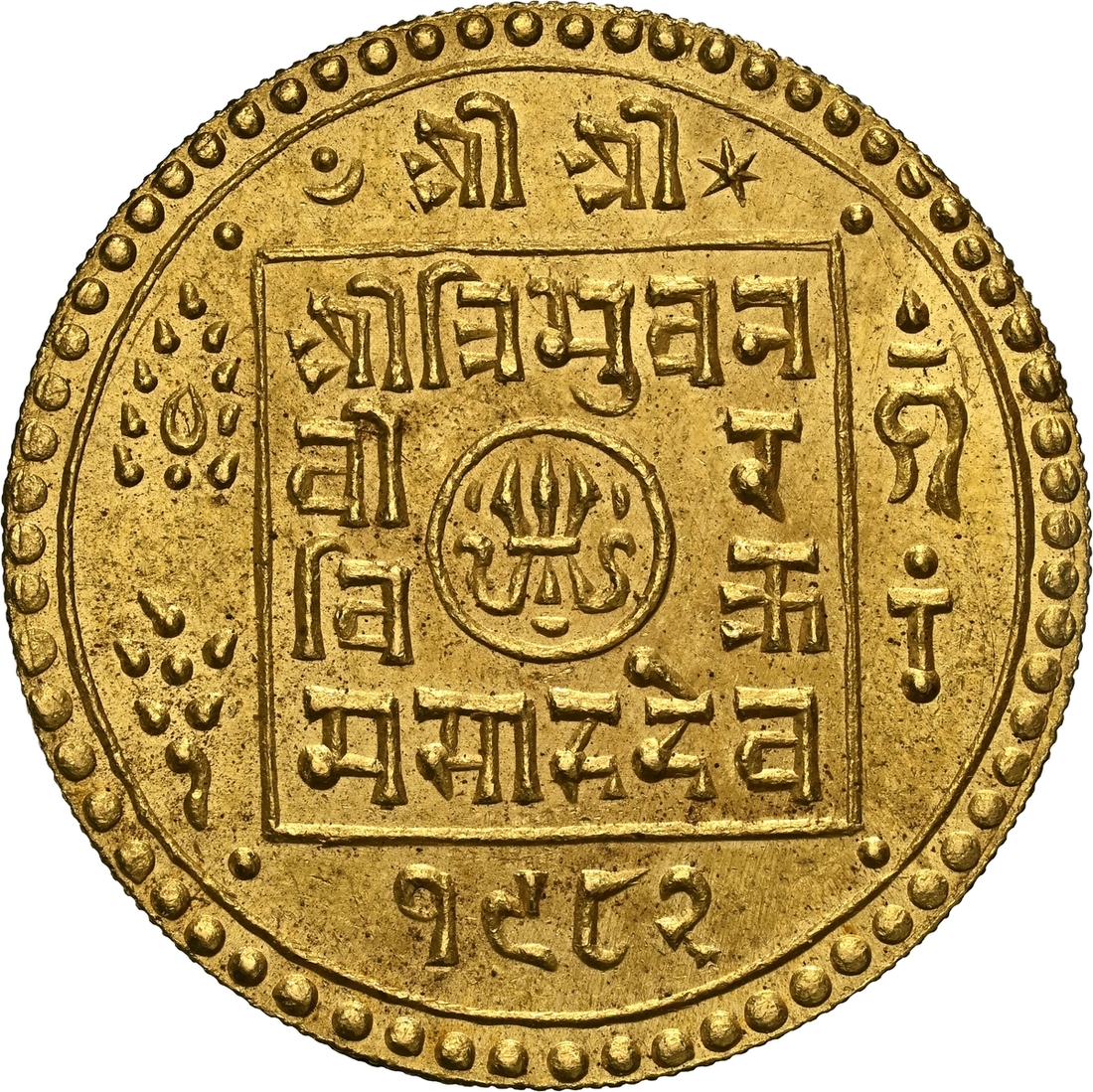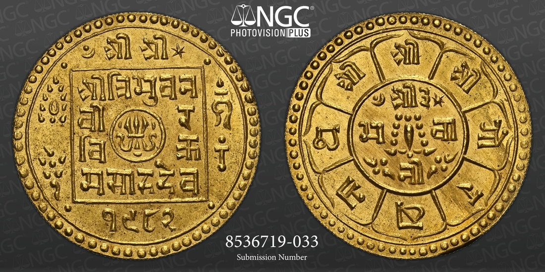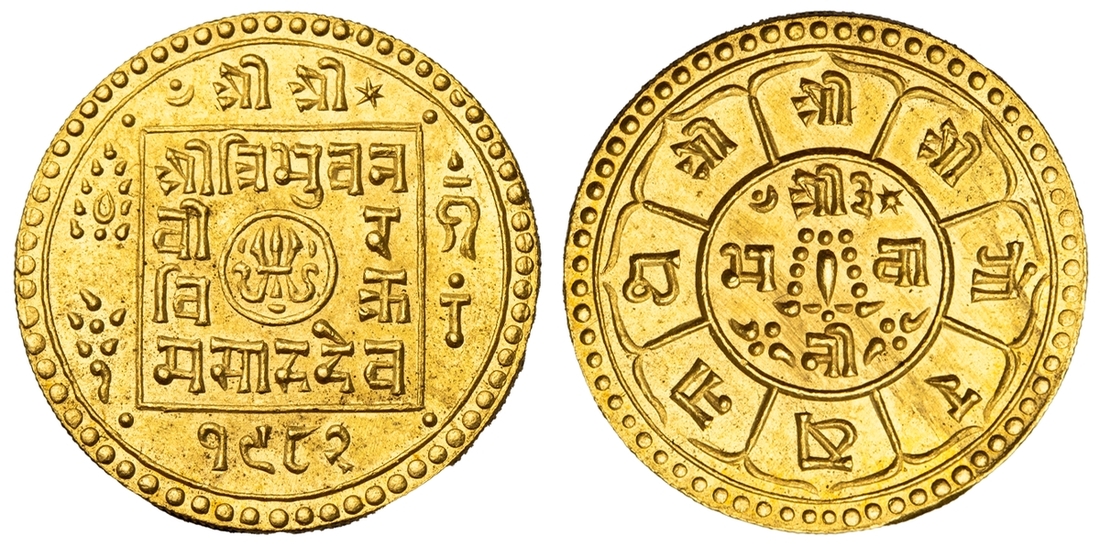 (g) NGC MS65 | Nepal, Tribhuvan Vira Vikrama Shah (1st reign, 1911-1955), gold Asarphi, VS 1982 (1925), Obv. trident with ribbons within small central circle, legend around, surrounded by square, Śrī Tribhuvana/Vīra/ Vikra/ma/Sāha Deva. Śrī Śrī with crescent and dot to left and sun to right, above square and date 1982 below square, cakra (disk) and lotus flower to left and conch shell and mace to right side of square, Rev. central circle with eight petals attached to it, sword with garland and legend Śrī 3 Bhavānī in centre of circle, moon to left and sun to right of Śrī 3, legend in eight petals Śrī Śrī Śrī Gorakhanātha, edge milled, 12.48g (KM 703.1), lustrous, uncirculated, in NGC holder, graded MS65 (Cert. #8536719-033)