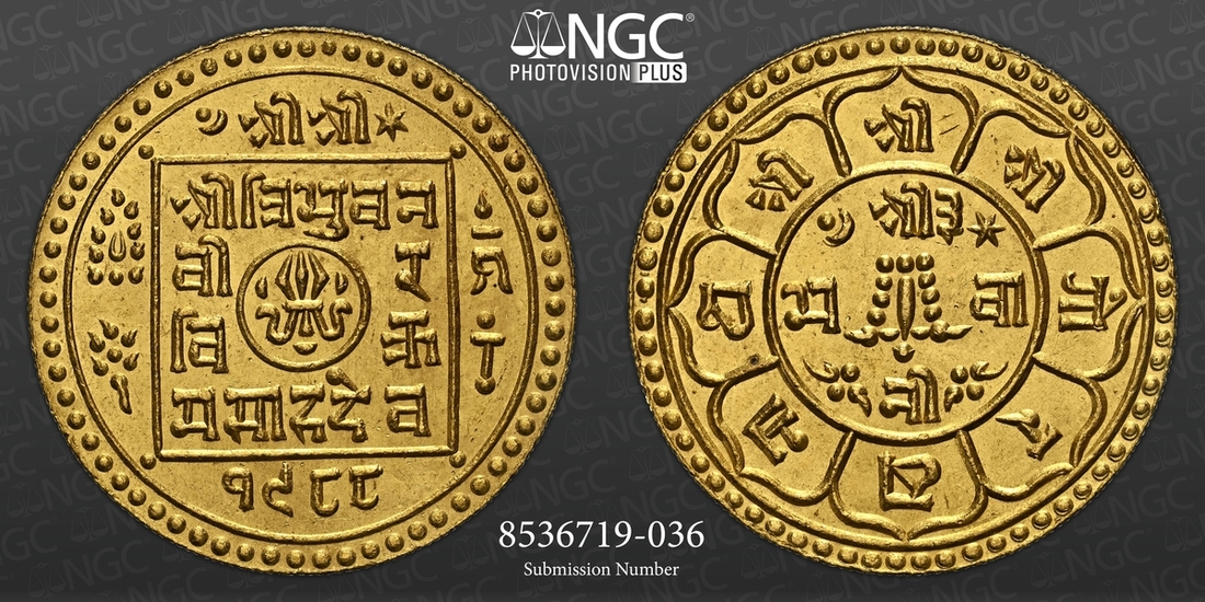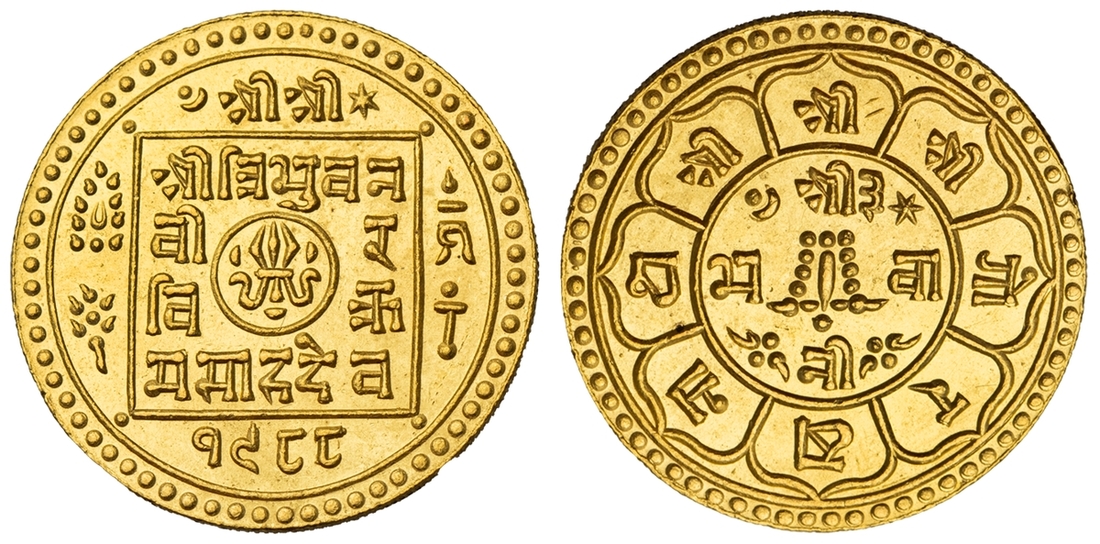 (g) NGC MS65 | Nepal, Tribhuvan Vira Vikrama Shah (1st reign, 1911-1955), gold Asarphi, VS 1988 (1931), Obv. trident with ribbons within small central circle, legend around, surrounded by square, Śrī Tribhuvana/Vīra/ Vikra/ma/Sāha Deva. Śrī Śrī with crescent and dot to left and sun to right, above square and date 1988 below square, cakra (disk) and lotus flower to left and conch shell and mace to right side of square, Rev. central circle with eight petals attached to it, sword with garland and legend Śrī 3 Bhavānī in centre of circle, moon to left and sun to right of Śrī 3, legend in eight petals Śrī Śrī Śrī Gorakhanātha, 12.38g, edge milled, (KM 703.1), proof-like finish, uncirculated, in NGC holder, graded MS65 (Cert. #8536719-036)