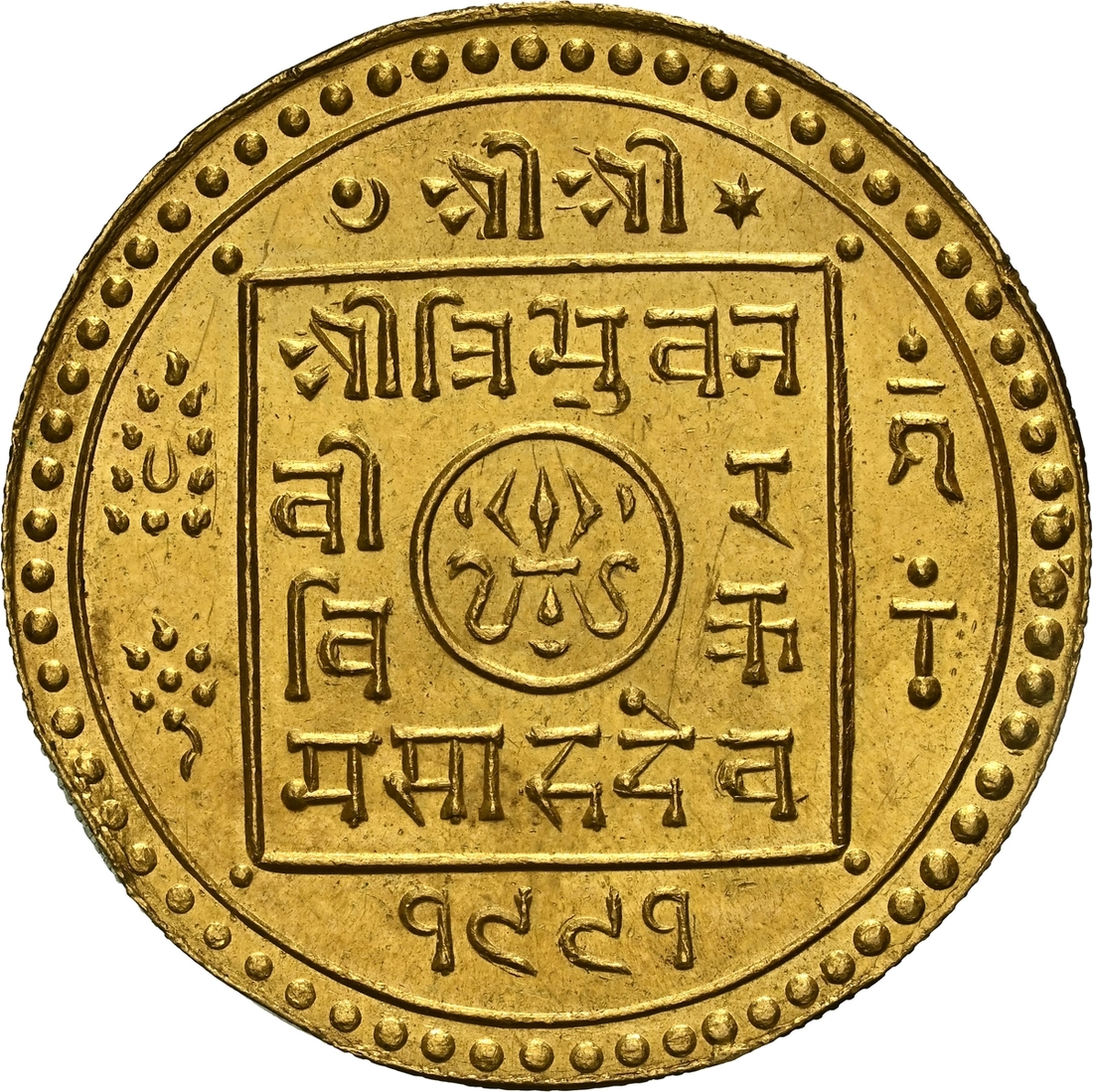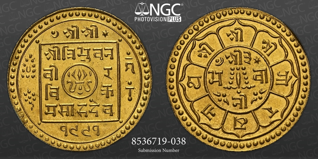 (g) NGC UNC | Nepal, Tribhuvan Vira Vikrama Shah (1st reign, 1911-1955), gold Asarphi, VS 1991 (1934), Obv. trident with ribbons within small central circle, legend around, surrounded by square, Śrī Tribhuvana/Vīra/ Vikra/ma/Sāha Deva. Śrī Śrī with crescent and dot to left and sun to right, above square and date 1991 below square, cakra (disk) and lotus flower to left and conch shell and mace to right side of square, Rev. central circle with eight petals attached to it, sword with garland and legend Śrī 3 Bhavānī in centre of circle, moon to left and sun to right of Śrī 3, legend in eight petals Śrī Śrī Śrī Gorakhanātha, edge milled, 12.32g (KM 703.1), faint edge bruise, otherwise with a flashy near brilliance, about uncirculated, in NGC holder, graded UNC DETAILS ~ Obverse rim damage (Cert. #8536719-038)