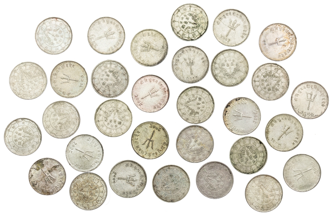 Nepal, Tribhuvan Vira Vikrama Shah (1st reign, 1911-1950), silver alloy 20-Paisa (25), VS 1989 (1932) - VS 2005 (1948), all known dates for series, Obv. large trident in centre, legend above, Śrī Tribhuvana/Vīra/Vikra/ma Sāha Deva, date below, Rev. trident with garland, second line reads bis paisa (twenty paisa), edges milled (KM 714, KM 715), fine to very fine; silver alloy 20-Paisa (6), VS 2006 (1949) - VS 2010 (1953), [excepting year VS 2008 which has not been recorded for this issue], much as before, edges milled (KM 716), very fine to uncirculated (31)