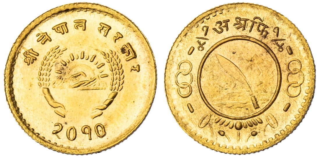 (g) Nepal, Tribhuvan Vira Vikrama Shah (2nd reign 1951-1955), gold ¼- Asarphi, VS 2010 (1953), Obv. rising sun behind mountains, ears of rice either side, legend above, Śrī Nepāl Sarakār, date 2010 below, Rev. kukri with blade facing left and mountains behind, within central circle, three intersecting circles to left and right of central circle and above legend ¼ āsarphī ¼, edge milled, 2.92g, 12h (KM 774), uncirculated
