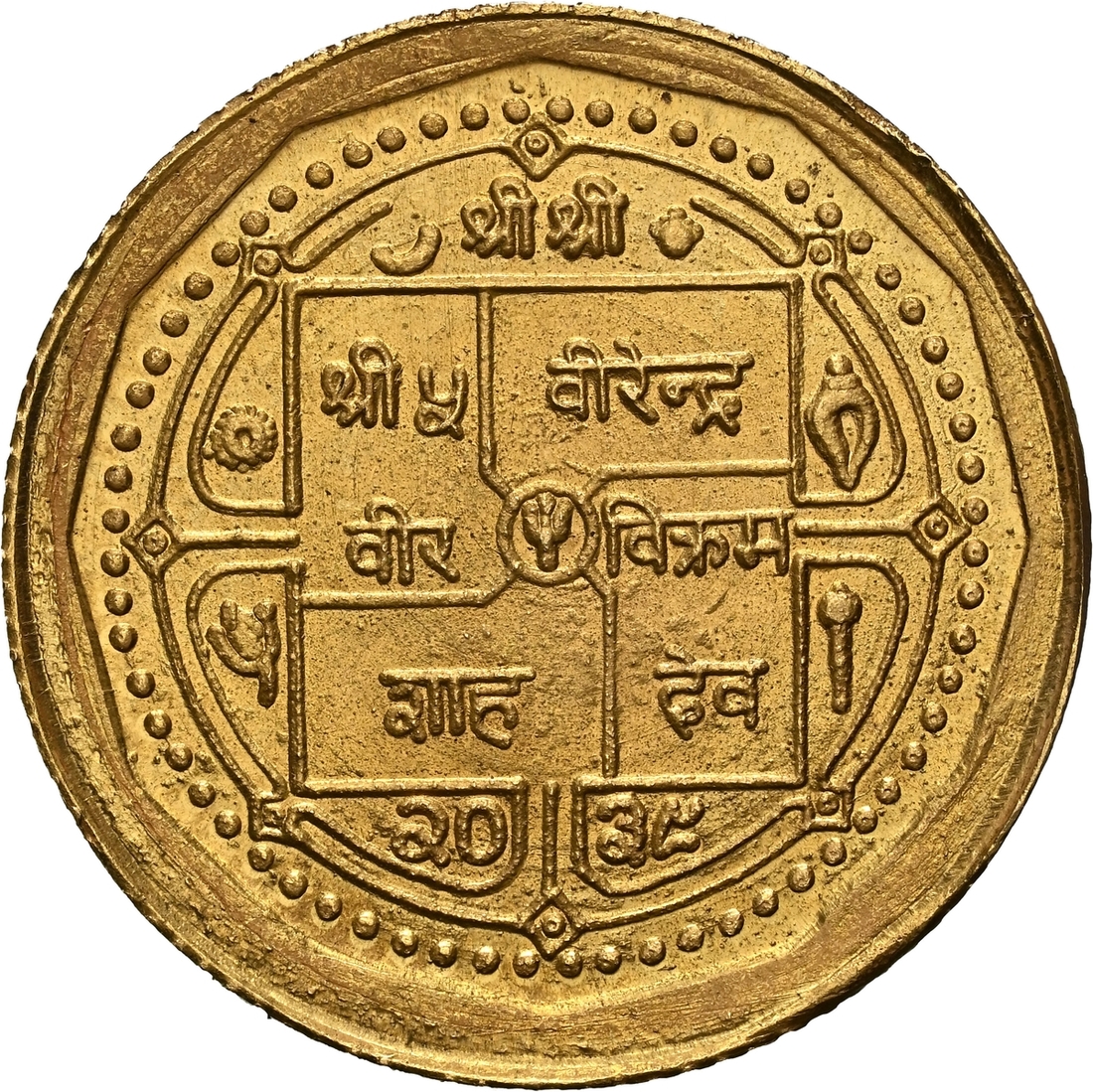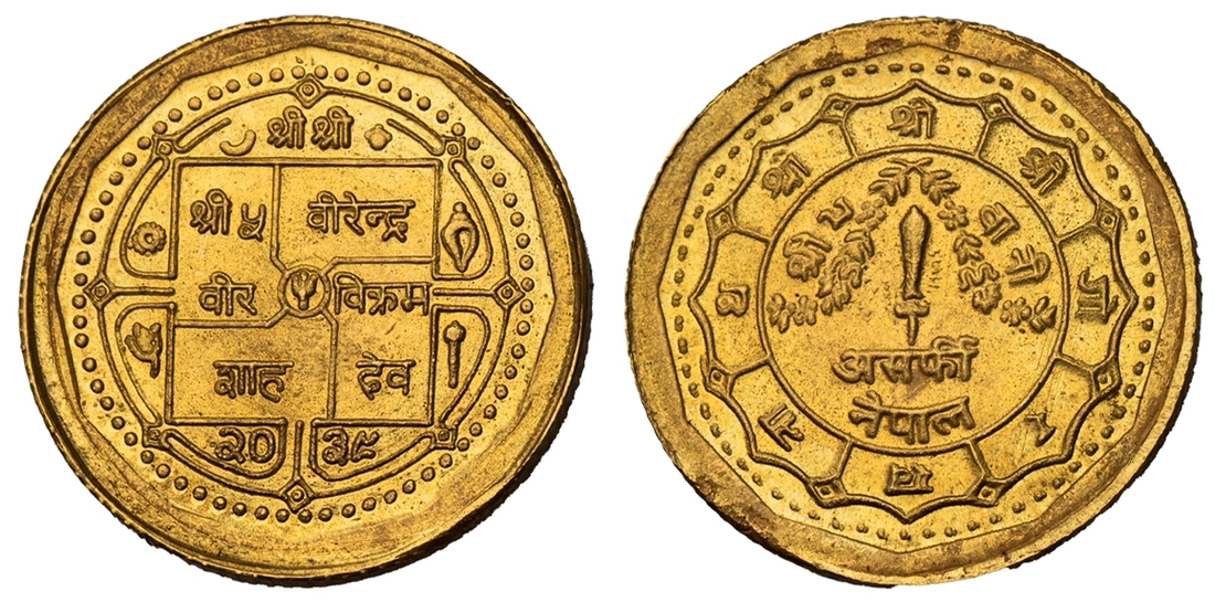 (g) Nepal, Birendra Vira Vikrama Shah (1972-2001), gold Asarphi, VS 2039 (1982), Obv. small central square with trident, surrounded by legend, all this within square which has openings on three sides, legend starts above square with Śrī Śrī and continues inside the square with Śrī 5 Birendra/ Vīra Vikra/ma Sāha Deva and date 2039 below, moon to left and sun to right of Śrī Śrī above square, cakra (discus) and lotus flower on left side, and conch and mace on right side of square, Rev. central circle with eight petals attached to it, sword with garland and legend Śrī Bhavānī on either side of garland in centre of circle, Ek āsarphī /Nepāl below, legend in petals Śrī Śrī Śrī Gorakhanātha, additional dodecagon near the rim on both sides, edge milled, 9.86g (KM 1022), struck from lightly rusted dies, uncirculated, a scarce survivor accounting to the instruction to have this debased issue melted, thus rare