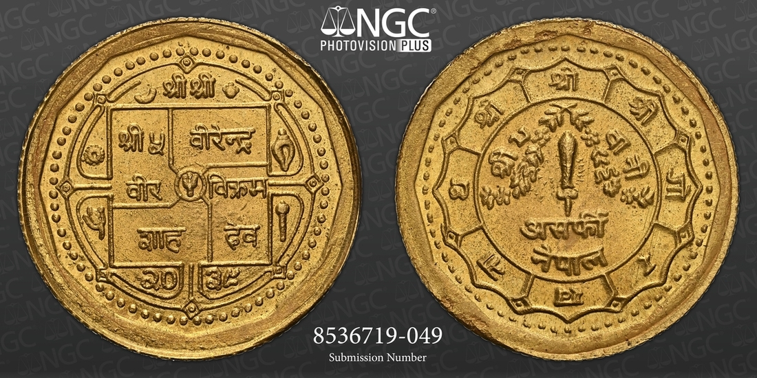 Regarding the gold coins dated VS 2039 Nicholas Rhodes reports the following: “I was told by Mr. Ishwari Raj Pradhan that while he was a mint master in the 1970's and 1980's coins were struck from pure gold bars supplied by the Palace, stated to be 0.999 fine.