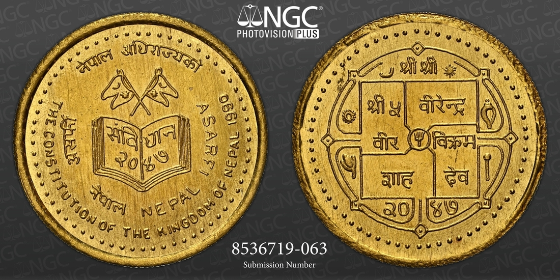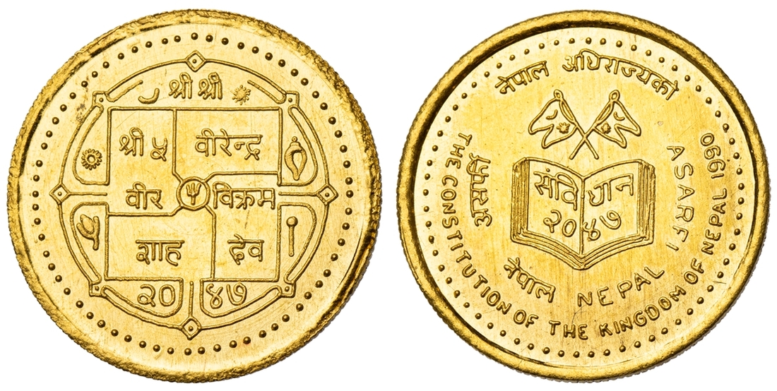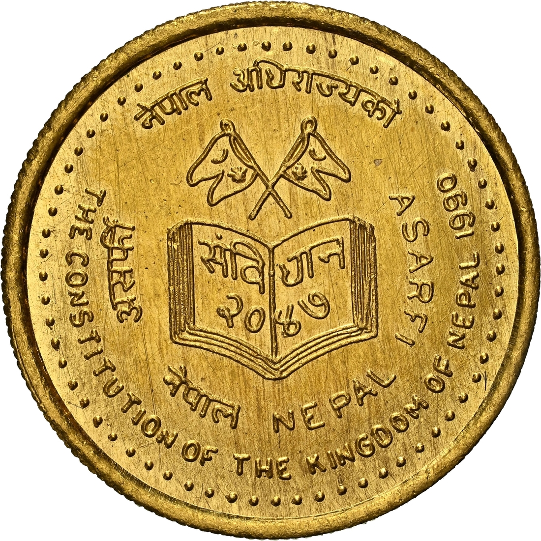 (g) NGC MS66 | Nepal, Birendra Vira Vikrama Shah (1972-2001), gold Asarphi, VS 2047 (1990), Obv. open book with two crossed Nepalese national flags above, legend in English and Nepali, English legend, "Nepal Asarfi/The Constitution of the Kingdom of Nepal 1990.", Rev. in the name of Birendra and very small central circle, date below, edge milled, 10.02g (KM 1054), adjustment marks to flan, lustrous, uncirculated, in NGC holder, graded MS66 (Cert. #8536719-063)
