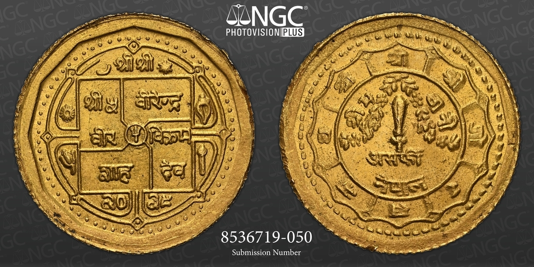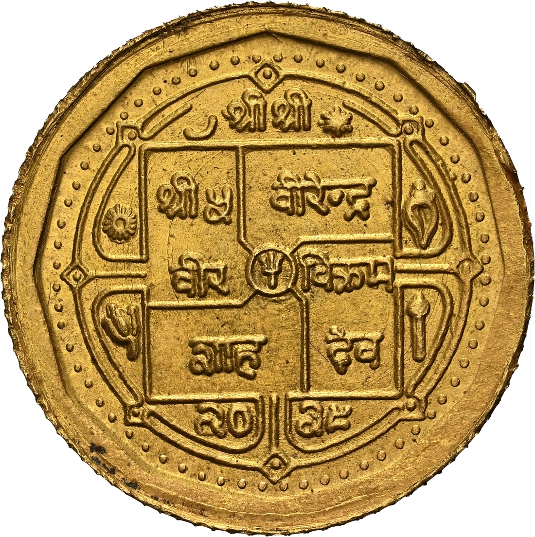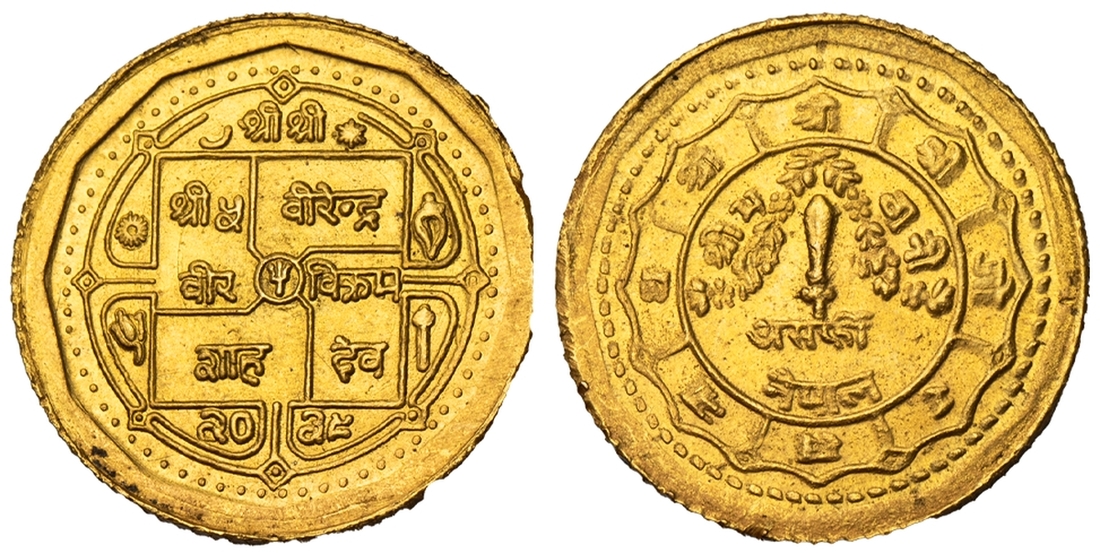 Regarding the gold coins dated VS 2039 Nicholas Rhodes reports the following: “I was told by Mr. Ishwari Raj Pradhan that while he was a mint master in the 1970's and 1980's coins were struck from pure gold bars supplied by the Palace, stated to be 0.999 fine.