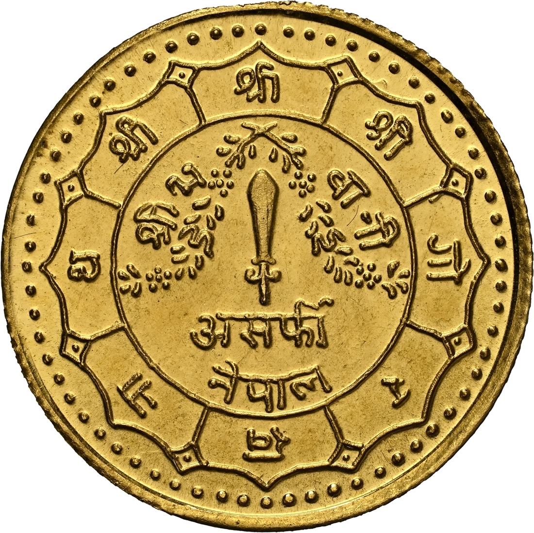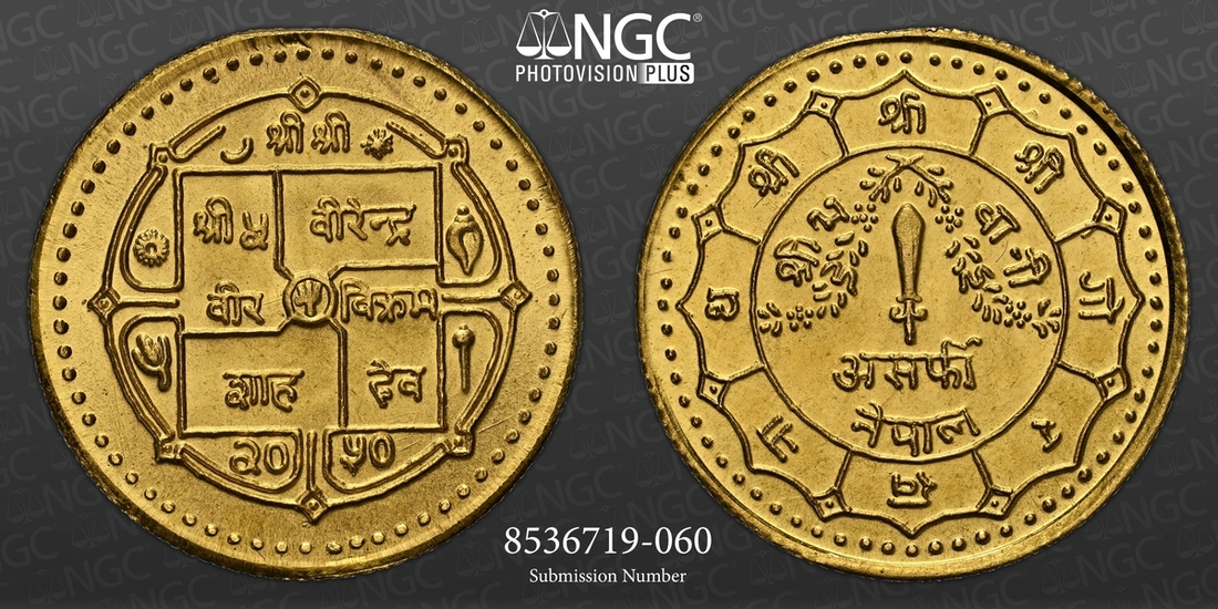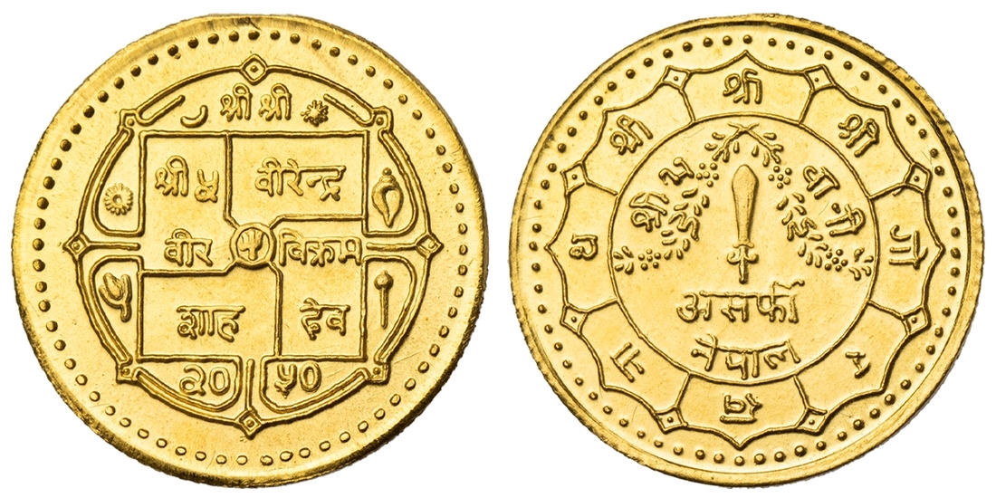 (g) NGC UNC | Nepal, Birendra Vira Vikrama Shah (1972-2001), gold Half-Asarphi, VS 2050 (1993), Obv. small central square with trident, surrounded by legend, all this within square which has openings on three sides and two double arches attached to three sides, but only a single arch attached to the upper side of the square, legend Śrī Śrī / Śrī 5 Virendra/ Vīra Vikrama/ Sāha Deva and date 2050 below, within two double arches, moon to left and sun to right of Śrī Śrī in upper arch, cakra (discus) and lotus flower within double arches on left side, and conch and mace within double arches on right side, Rev. central circle with eight petals attached to it, sword with garland, and legend Śrī Bhavānī/Asarphī/ Nepāl in centre of circle, legend in petals Śrī Śrī Śrī Gorakhanātha, edge milled, 5.00g (KM 1021a), light filing mark to edge, with a pleasing mint bloom, uncirculated, in NGC holder, graded UNC DETAILS ~ Edge filing (Cert. #8536719-060)