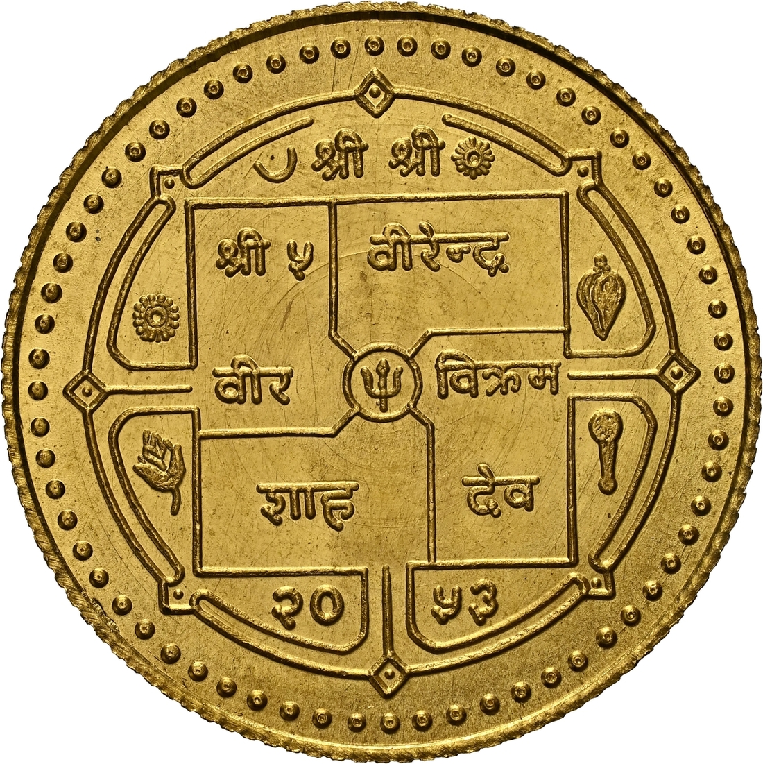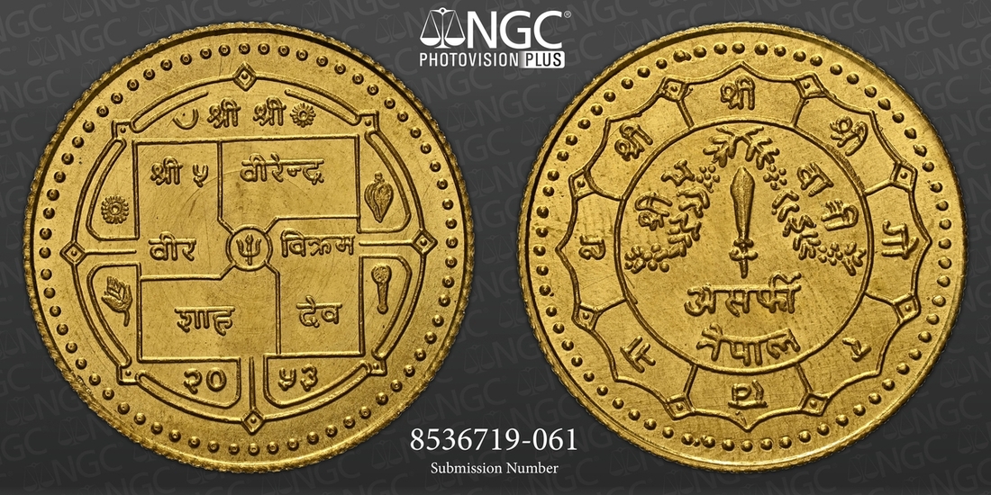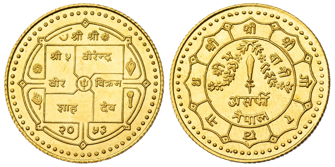 (g) NGC MS66 | Nepal, Birendra Vira Vikrama Shah (1972-2001), gold Half-Asarphi, VS 2053 (1996), Obv. small central square with trident, surrounded by legend, all this within square which has openings on three sides and two double arches attached to three sides, but only a single arch attached to the upper side of the square, legend Śrī Śrī / Śrī 5 Virendra/ Vīra Vikrama/ Sāha Deva and date 2053 below, within two double arches, moon to left and sun to right of Śrī Śrī in upper arch, cakra (discus) and lotus flower within double arches on left side, and conch and mace within double arches on right side, Rev. central circle with eight petals attached to it, sword with garland, and legend Śrī Bhavānī/Asarphī/ Nepāl in centre of circle, legend in petals Śrī Śrī Śrī Gorakhanātha, edge milled, 5.00g (KM 1021a), with a mint bloom, uncirculated, in NGC holder, graded MS66 (Cert. #8536719-061)