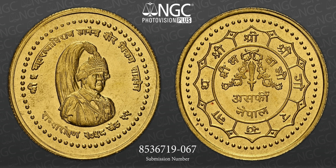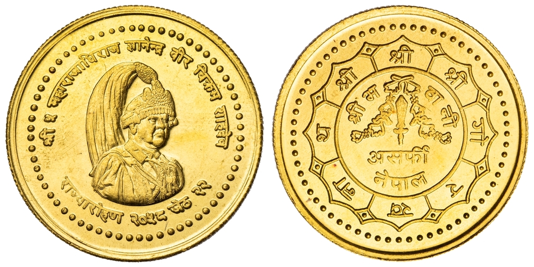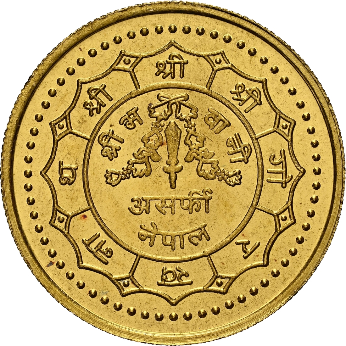 (g) NGC MS65 | Nepal, Gyanendra Vira Vikrama Shah (2nd reign, 2001-2008), 'Coronation' gold Asarphi, VS 2058 (2001), Obv. Gyanendra wearing a plumed crown, legend around, Rev. large sword with garland and legend Śrī Bha/vānī on either side of garland in central circle, below legend Aśarphi/ Nepāl, legend in eight petals which are attached to the central circle, Śrī Śrī Śrī Gorakhanātha, edge milled, 11.60g (KM -), some faint hairlines scratches, otherwise lustrous, about uncirculated, in NGC holder, graded MS65 (Cert. #8536719-067)