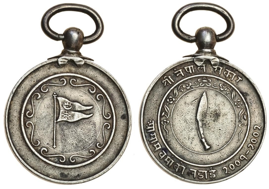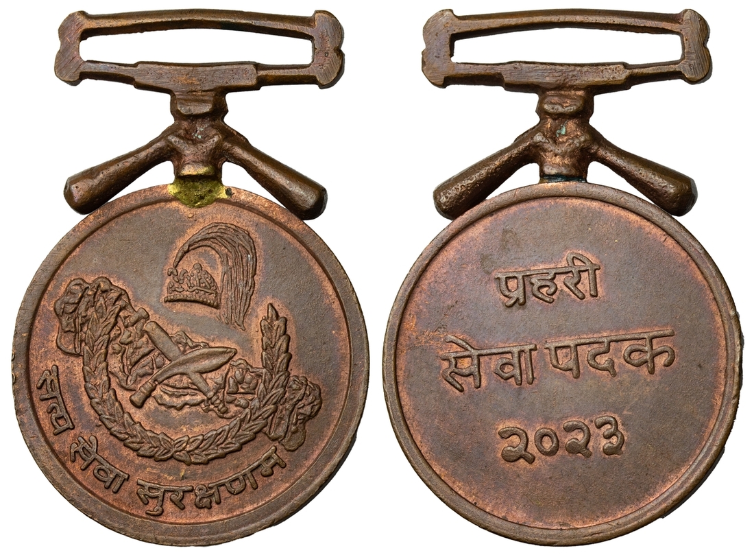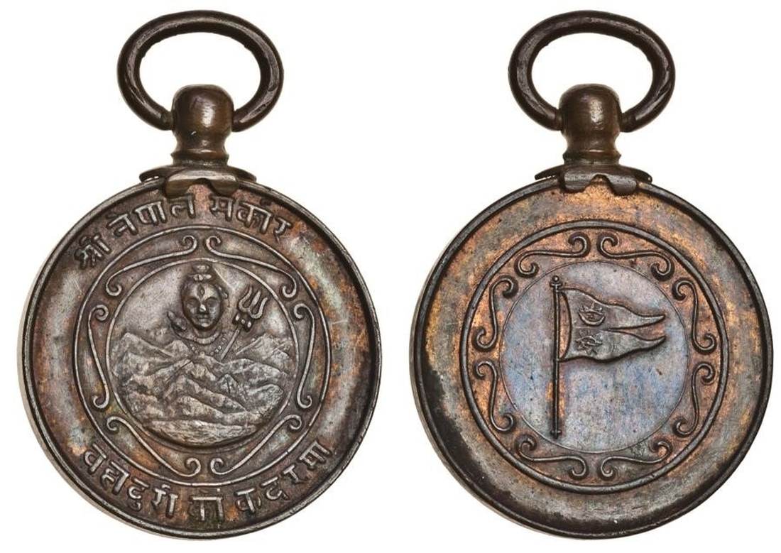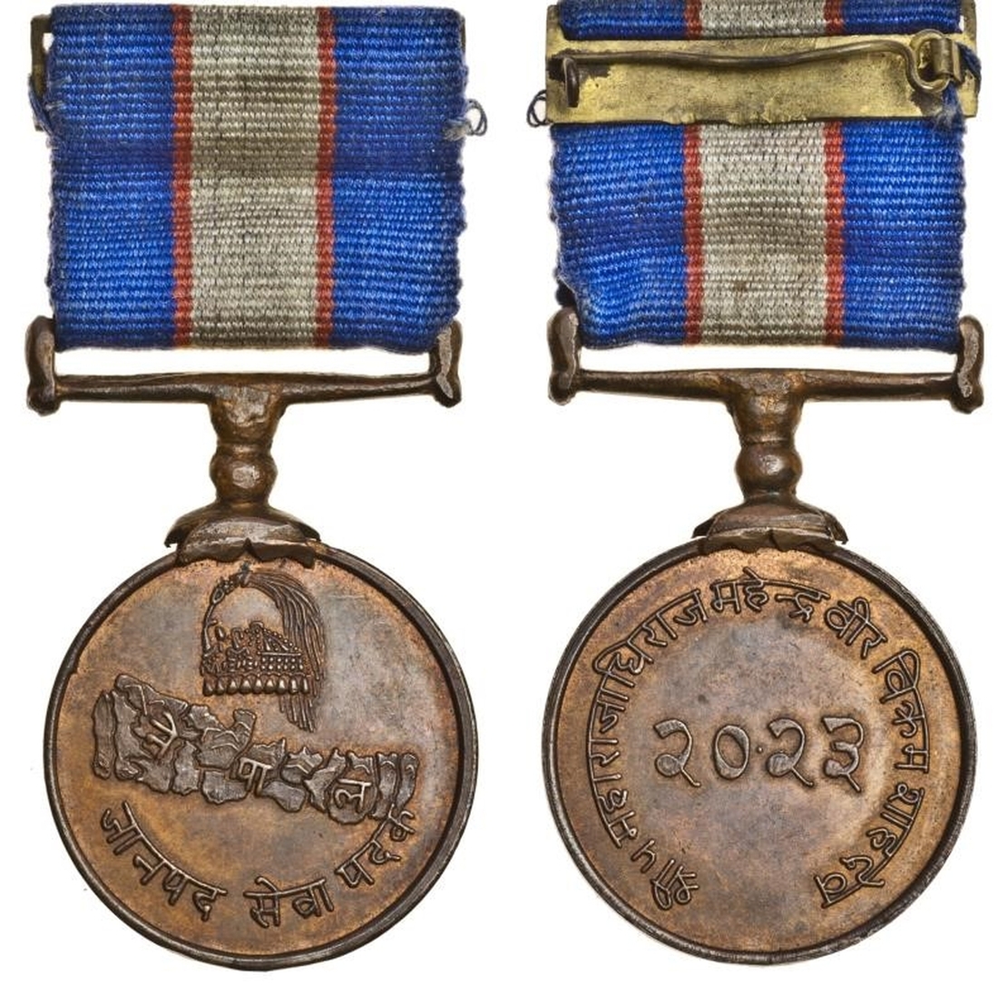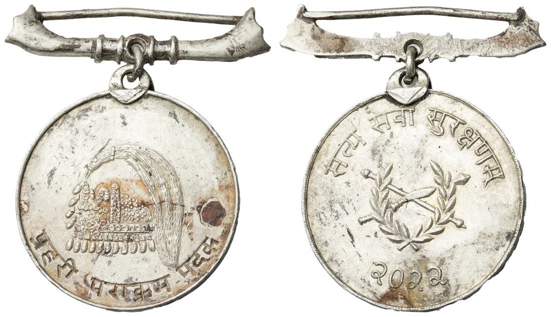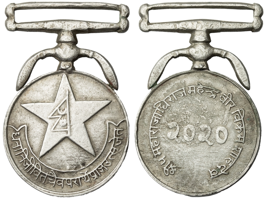 Collection of Military and Service Medals (11) | Nepal, Tribhuvan Vir Vikram Shah (1911-1955), Jānapada Dīrgha Sevā Patta Medal, undated, instituted in 1937, in the shape of a five-pointed star, enamelled Nepalese flag and two crossed swords superimposed on framework of five-pointed star, (Vibhooshana Committee, 1967, p. 19 and plate XL), with some contact marking and damage to enamel, with suspension, very fine and rare; and, Nepal, Government of Nepal, Assam-Burma Medal (Assam Burma Ladain Padak), VS 2001-2002 (1944-1945), Obv. flag of Nepal, border aroundRev. Khukri in centre and legend above Shri Nepal Sarkar ("Government of Nepal"), legend below, Assam Burma ko ladai ("Assam Burma war") VS 2001-2002, some edge bruising and staining, yet with suspension, very fine; and, Nepal, Government of Nepal, copper Bravery Medal (Bahaduree-Padaka), undated, Obv. bust of Shiva and trident on top of Himalaya, inscription above, Shri Nepal Sarkar ("Government of Nepal") and below, bahaduri ko kadar ma ("medal for bravery), Rev. flag of Nepal in centre and ornamental circle around, some edge knocks, yet with lustre and with suspension, good very fine; and, Nepal, Birendra Vir Vikram Shah (1972-2001), King Birendra Coronation Medal, VS 2031 (1975), Obv. crown with moon and sun on either side, disc, lotus, conch and mace (emblems of Vishnu) and legend Nepal/Shri 5 Maharajadhiraja Birendra Vira Vikrama Saha Deva, Rev. shubha rajyabhisek 2031 ("Auspicious Coronation 2031"), suspension formed by a pair of Khukris, with original suspension and riband, with a flashy lustre, extremely fine; Remote Himalaya Service Medal, dated VS 2020 (1963), Obv. the Himalayas with Nepalese flag on top and legend below, Krichchhrepina Chalatyava Dhīrānām Nishchala Mana ("Hardship sways no steady mind"), Rev. legend referring to Mahendra Bir Vikram Shah Deva and date 2020 (Vibhooshana Committee, 1967, p. 18 and plate XXXIX), with suspension, very fine and scarce; and, Nepal, Mahendra Vir Vikram Shah (1955-1972), bronze Prahari Sewa Padak Medal, for police service, VS 2023 (1966), Obv. royal crown of Nepal, map of Nepal under two crossed khukris, and wreath below, legend near lower rim, Satya Sevā Surakshanam ("He serves best who safeguards most"), Rev. legend in three lines, Paharī/ Sevā Padaka. /2023 (Vibhooshana Committee, 1967, p. 20 and plate XLI), evidence of re-mounting to suspension, with lustre to fields, very fine; and, Nepal, Mahendra Vir Vikram Shah (1955-1972), Overseas Service Medal (Paradesa Sewa Padak), VS 2020 (1963), Obv. five-pointed star with Nepalese National flag and legend below, Dhanāni Jīvitamchaiva Parārthe Prājna Utsrijet ("Let the wise sacrifice his all for others"), Rev. date 2020 in centre, legend Srī 5 Maharājadhiraja Mahendra Vira Vikrama Saha Deva around (Vibhooshana Committee, 1967, p. 18 and plate XXXIX), reverse struck from rusted dies and pitted, with suspension, very fine; and, Nepal, Mahendra Vir Vikram Shah (1955-1972), Police Gallantry Medal (Praharee Parakrama Padak), VS 2022 (1965), Obv. royal crown and incuse legend below, Praharī Parākrama Padaka, Rev. Khukri and staff crosswise under wreath, legend Satya Sevā Surakshanam ("He serves best who safeguards most") above and 2022 below (Vibhooshana Committee, 1967, p. 19 and plate XL), with some contact marks and staining, yet with suspension, very fine; Mahendra Vir Vikram Shah (1955-1972), copper Civil Long Service Medal, VS 2023 (1966), Obv. Janapada Seva Padaka and Nepal on map of the country, crown above, Rev. Shri 5 Maharajadhiraja Mahendra Vira Vikrama Saha Deva / 2023, with riband and original suspension, lustrous fields, about extremely fine; and another, as before, with riband and original suspension, lustrous fields, extremely fine; and, Nepal, Mahendra Vir Vikram Shah (1955-1972), bronze Long Service Medal, VS 2023 (1966), Obv. six-pointed star with trident and damaru (double drum) superimposed on underlying map of Nepal, royal crown on top, Rev. legend in three lines, Sainika/ Sevā Padaka/2023, (Vibhooshana Committee, 1967, p. 20 and plate XLI), contact marked, with pleasing lustre, with suspension and later replacement riband, good very fine (11)