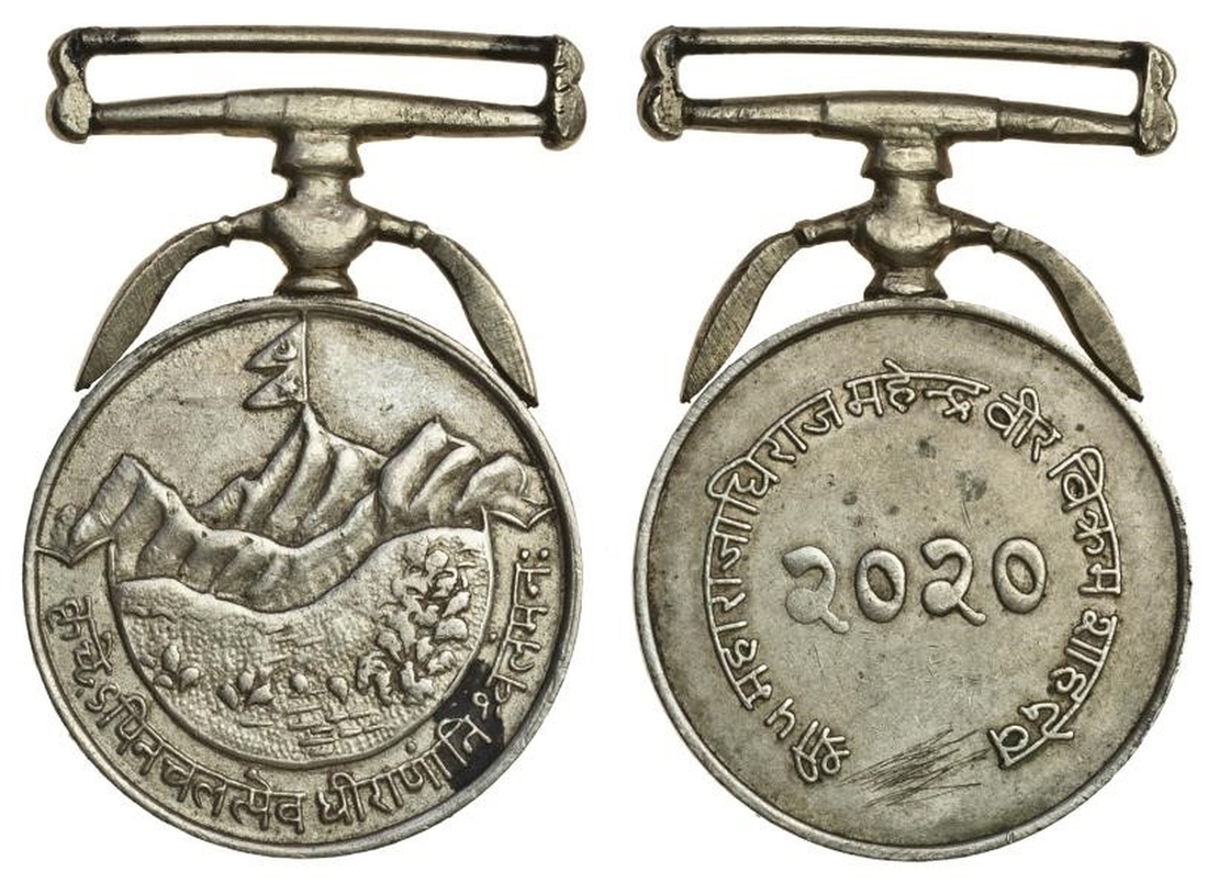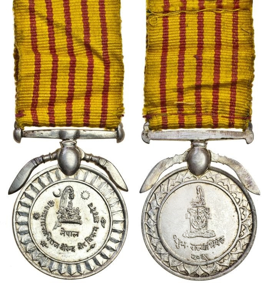 The fourth medal was struck for the coronation of Tribuvan Vir Vikram. Normally the VS era year is converted into Western Era year by subtracting 57 years which in this case would result in AD 1974. However, the coronation took place in February 1975, before the New Year 2032 of the Vikram Samvat Era had started.