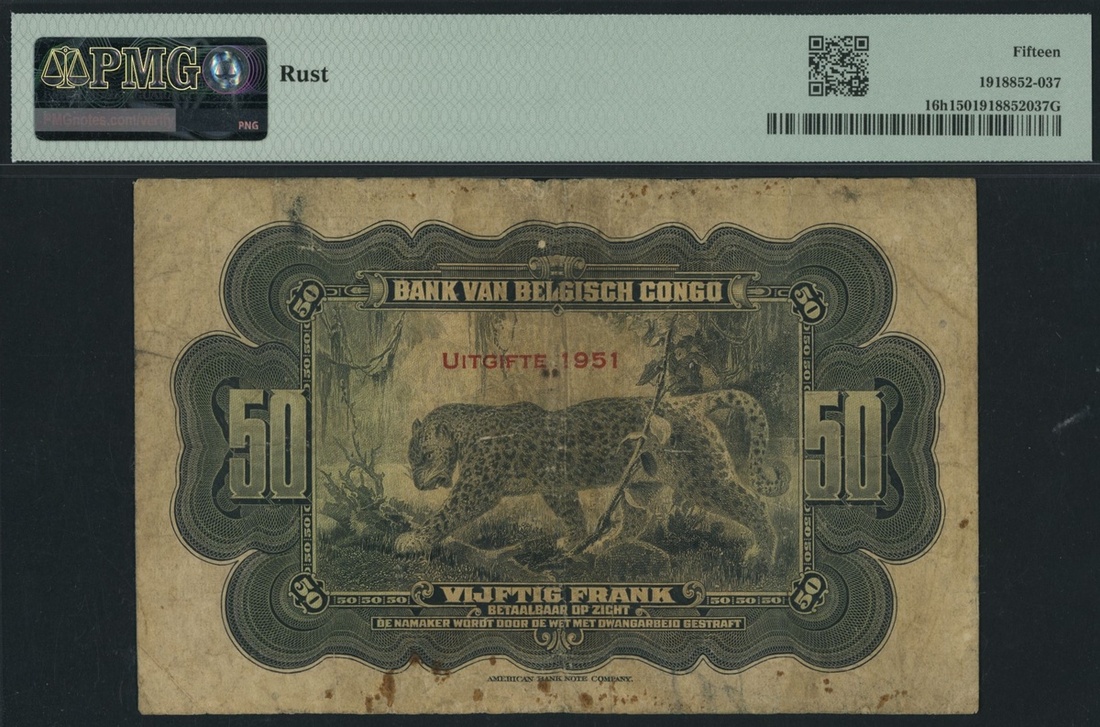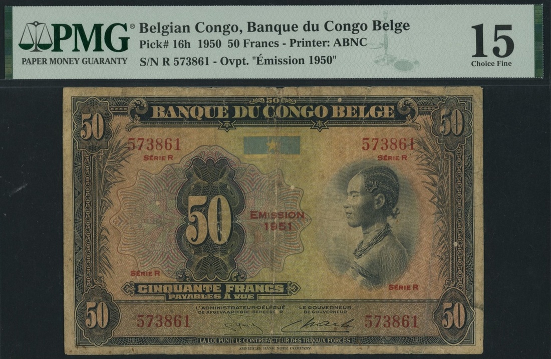 (x) Banque du Congo Belge, Belgian Congo, 50 Francs, 1951, serial number R573861, (Pick 16h, BNB 218), in PMG holder 15 Choice Fine, rust, only 4 notes in a higher grade on PMG Census