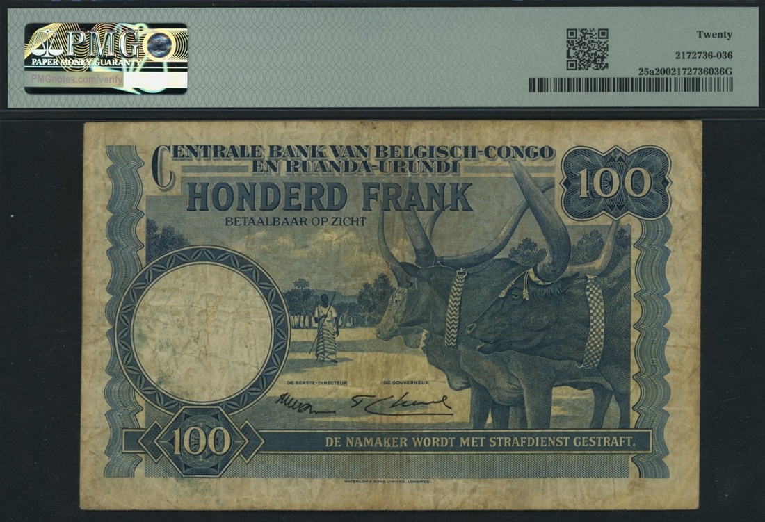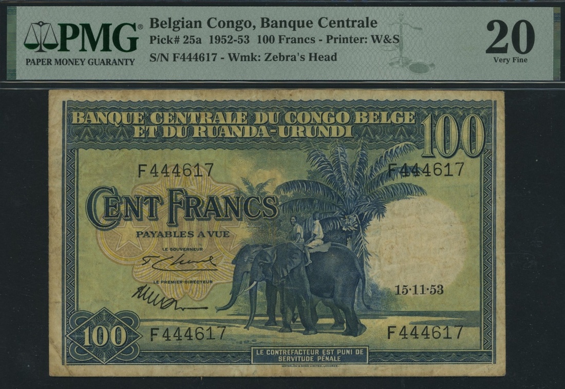 (x) Banque Centrale du Congo Belge et du Ruanda-Urundi, Belgian Congo, 100 Francs, 15th November 1953, serial number F444617, (Pick 25a, BNB 395), in PMG holder 20 Very Fine