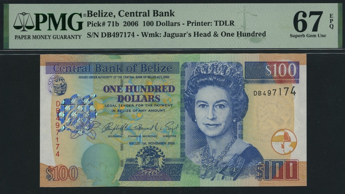 Central Bank of Belize, 100 Dollars, 2006, serial number DB7174, (Pick 71b, BNB 329b), in PMG holder 67 EPQ Superb Gem Uncirculated, only 6 notes in a higher grade on PMG Census