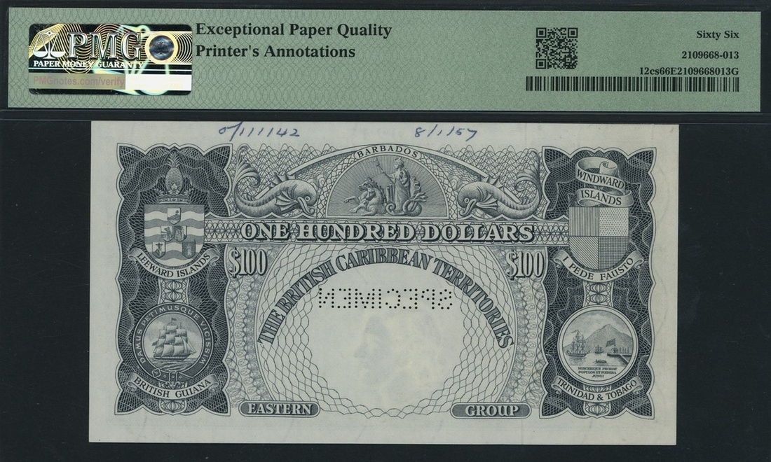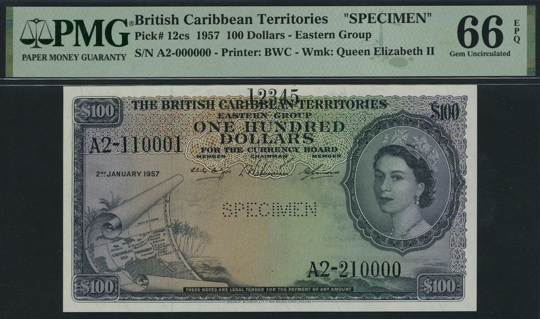 (x) Eastern Group, British Caribbean Territories, [Top Pop] specimen $100, 2nd January 1957, serial numbers range,