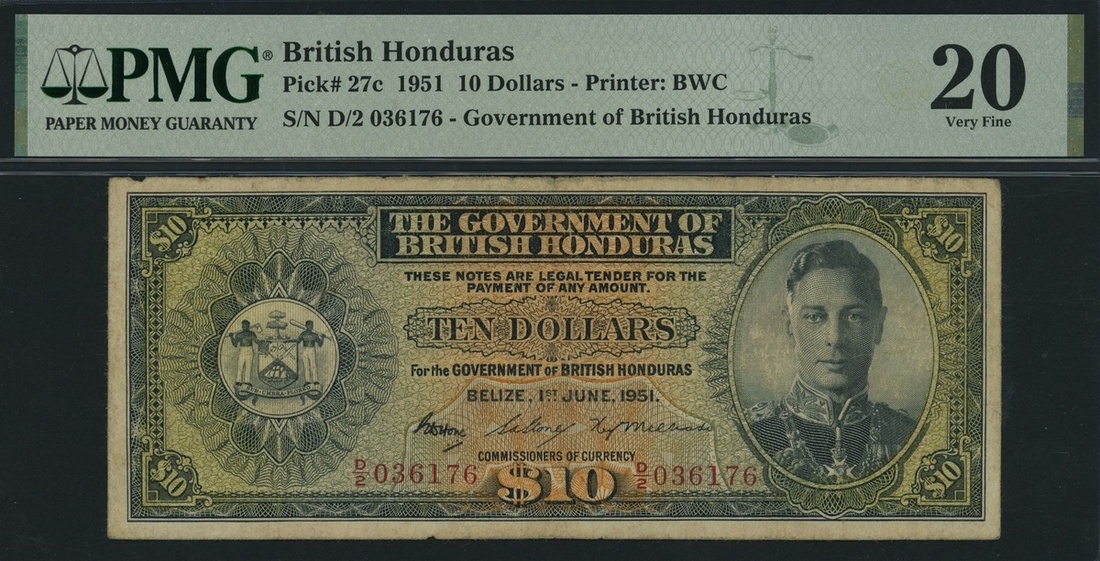 (x) The Government of British Honduras, 10 Dollars, Belize, 1st June 1951, serial number D/2 036176, (Pick 27c, BNB 126b), in PMG holder 20 Very Fine