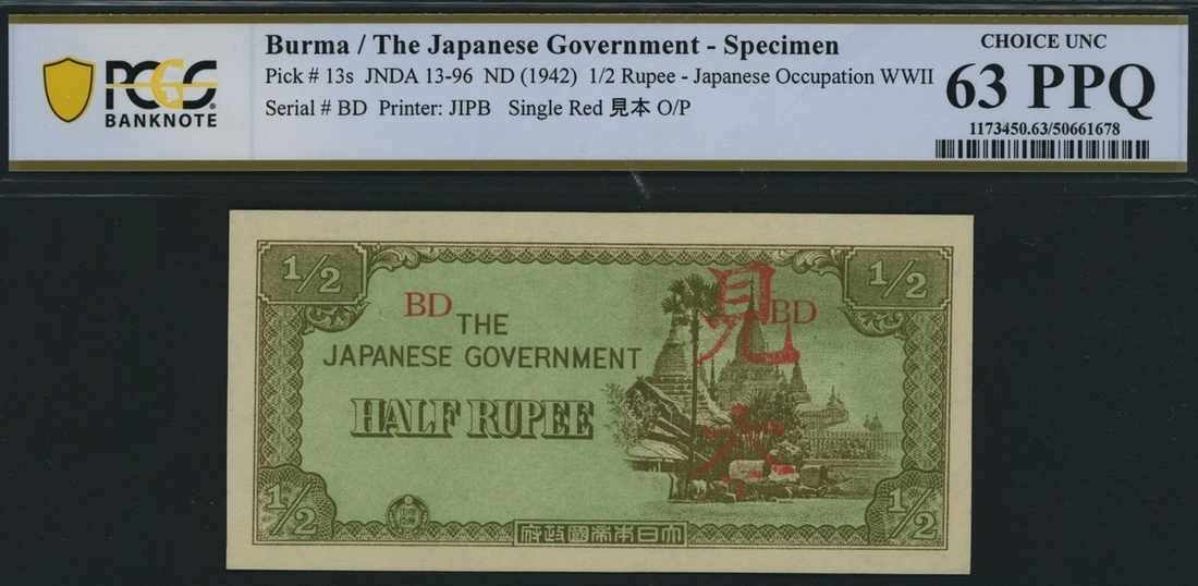 (x) Burma, Japanese Occupation, WWII, [Top Pop] specimen 1/2 rupee, ND (1942), serial number BD, (Pick 13s, BNB 305as), in PCGS holder 63 PPQ Choice Uncirculated, single graded by PCGS Banknote, scarce