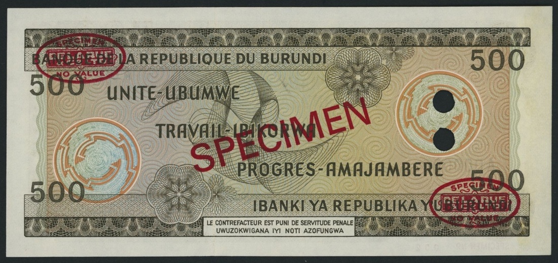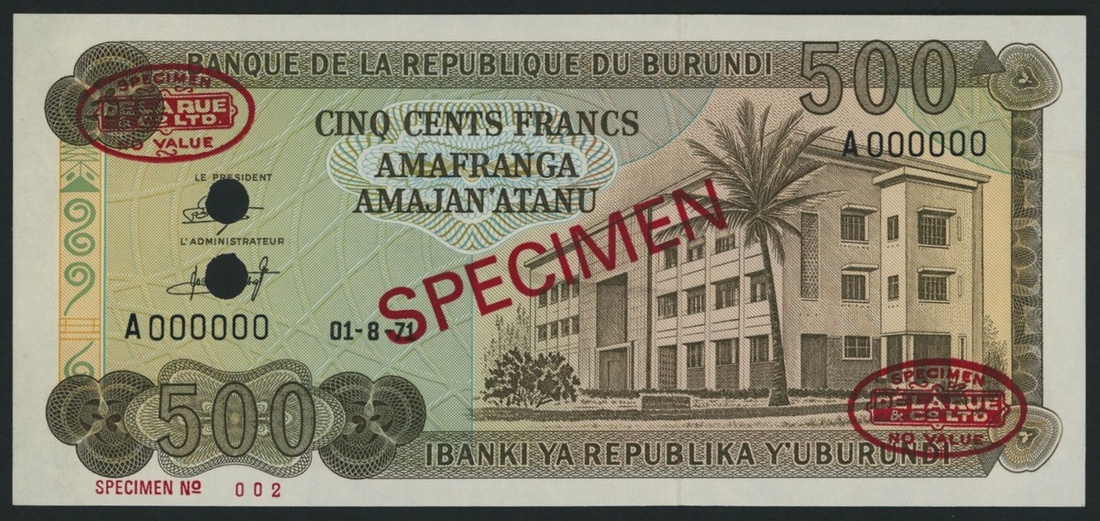 Banque de la Republique du Burundi, Specimen 500 Francs, 1st of August 1971, serial number A000000 002,