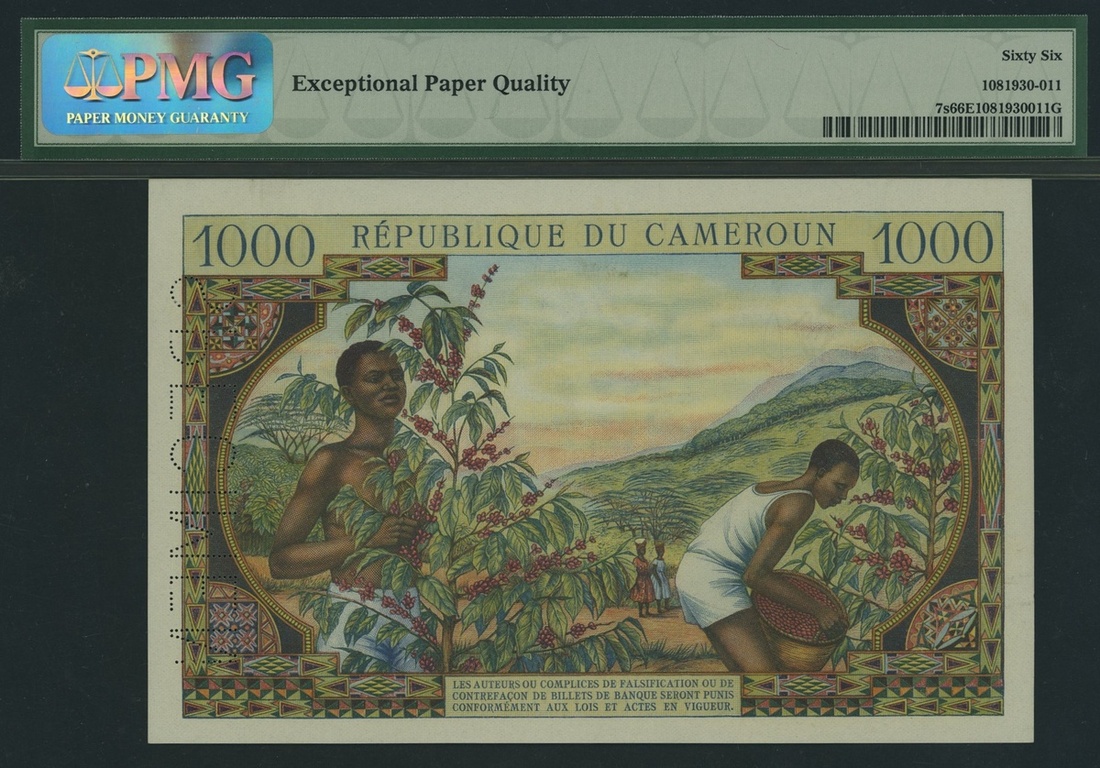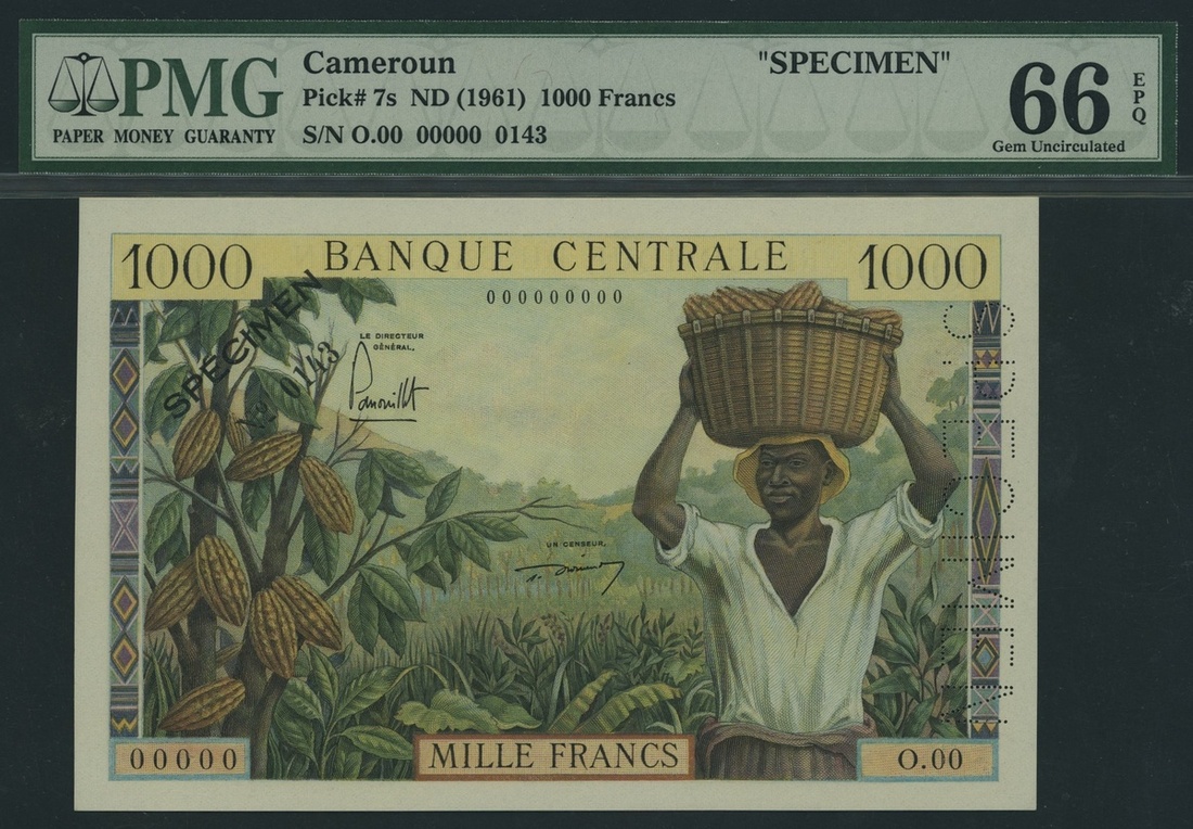 (x) Banque Centrale, Cameroun, Cameroon, [Top Pop] specimen 1000 Francs, ND (1961), serial number O.00 00000 0143, (Pick 7s, BNB 301as1), in PMG holder 66 EPQ Gem Uncirculated, the Sole Finest example graded by PMG