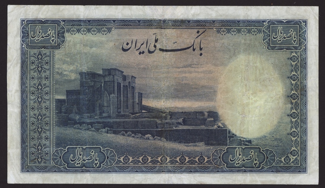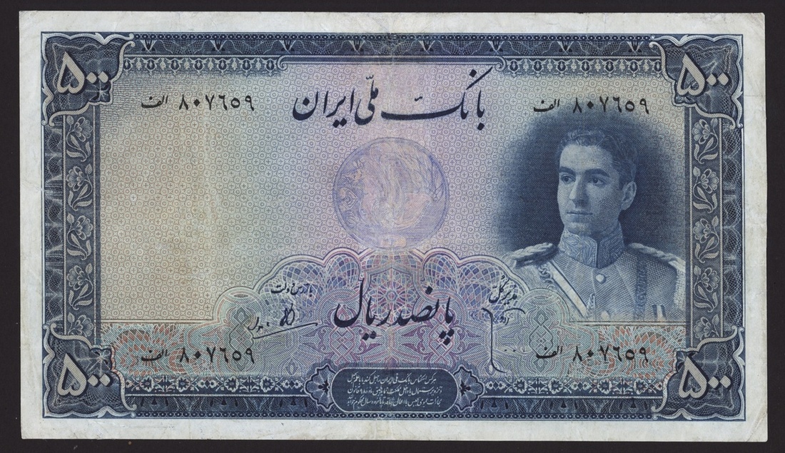 National Bank of Iran, 500 Rials, ND (1944), serial number 807659, (Pick 45a, BNB 140a), central stain suggesting repairs, otherwise very fine. This lot is subject to import restrictions into certain countries