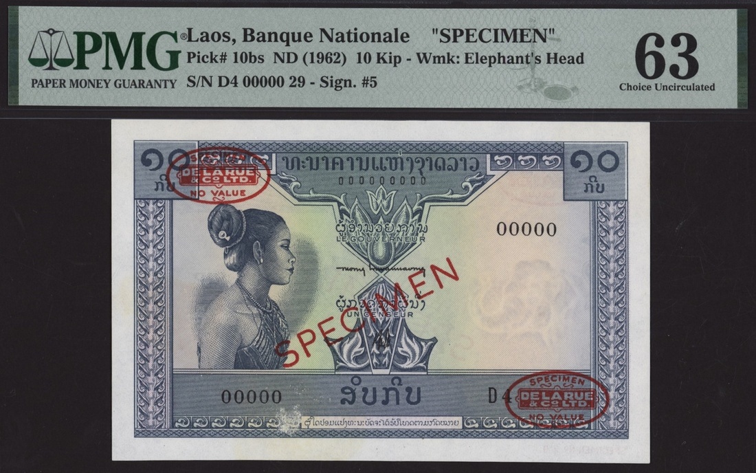 (x) Banque Nationale du Laos, specimen 10 kip, ND (19622), serial number 0, (Pick 10bs), in PMG holder 63 Choice Uncirculated, minor foreign substance