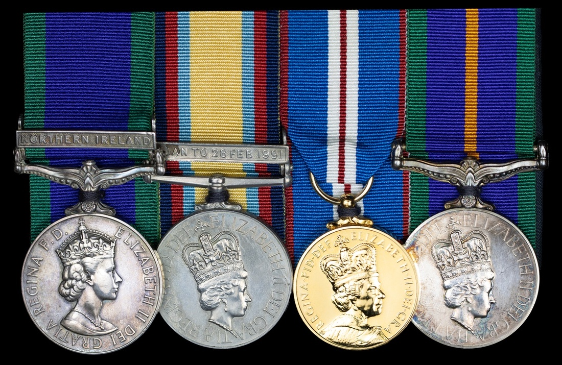 General Service 1962-2007, 1 clasp, Northern Ireland (24506601 Pte JHL Harvey KOSB); Gulf 1990-91, 1 clasp, 16 Jan to 28 Feb 1991 (24506601 L/Cpl JHL Harvey KOSB); Jubilee 2002; Accumulated Campaign Service Medal, E.II.R. (24506601 Sgt JHL Harvey R Irish (HS)), hallmarked edge, court mounted for wear, very fine (4)