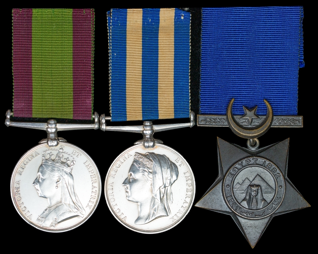 Afghanistan 1878-1880, no clasp (42/686 Pte. D. King. 85th Foot.); Egypt and Sudan 1882-89, dated reverse, no clasp (657 Pte. D. King. 1/Shrops: L.I.); Khedive's Star, dated 1882, unnamed as issued, light contact marks and edge bruising, overall very fine (3)