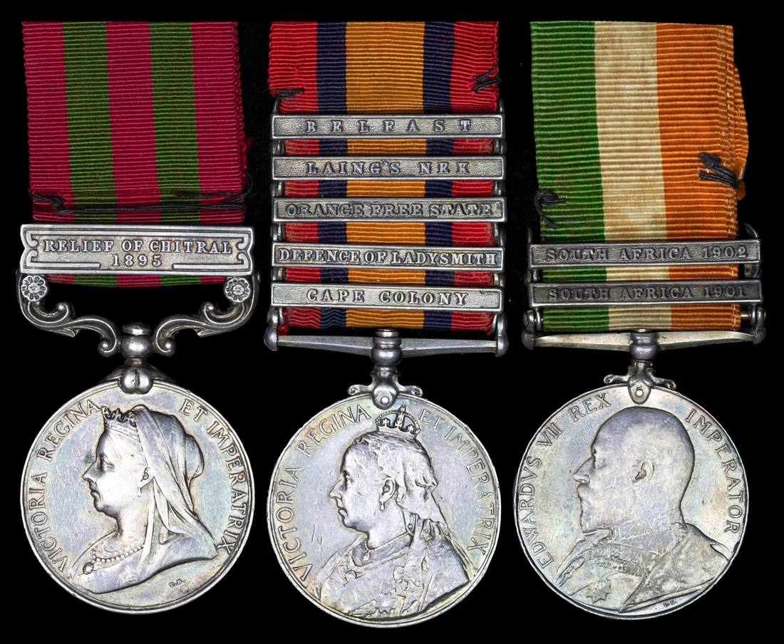 India General Service 1895-1908, 1 clasp, Relief of Chitral 1895 (5621 Pte. F. G. Hutchings 1st Bn K.R. Rifle Corps), suspension slack; Queen's South Africa 1899-1902, 5 clasps, Cape Colony, Defence of Ladysmith, Orange Free State, Laing's Nek, Belfast (5621 Pte F. G. Hutchings. K.R.R.C.); King's South Africa 1901-02, 2 clasps, South Africa 1901, South Africa 1902 (5621 Pte F. G. Hutchings. K.R.R.C.), contact wear and contact marks, very fine overall (3)